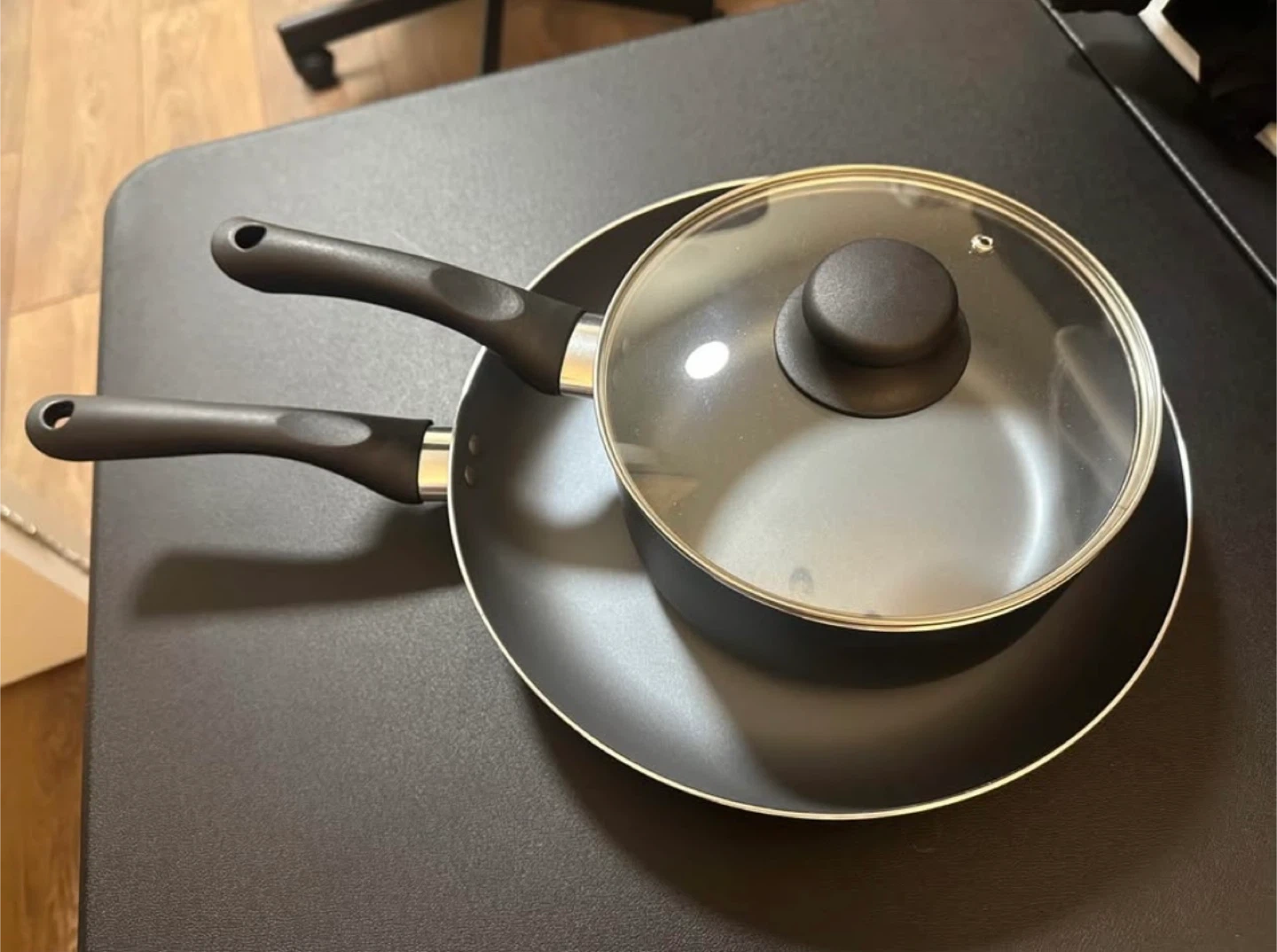 Selling a frying pan and lidded pot set.