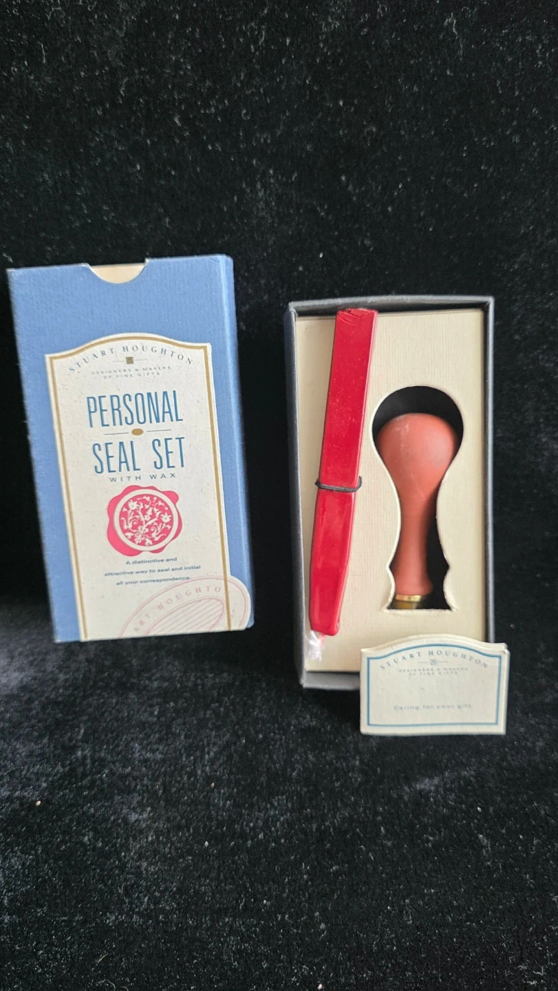 This is a personal seal set with wax from Stuart Houghton. It's designed for sealing correspondence. Instructions for use are included.