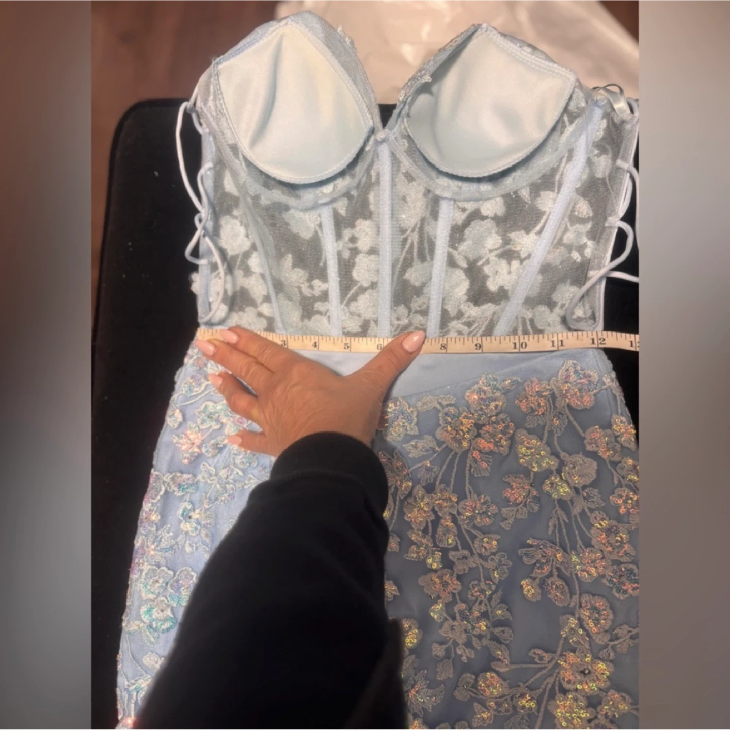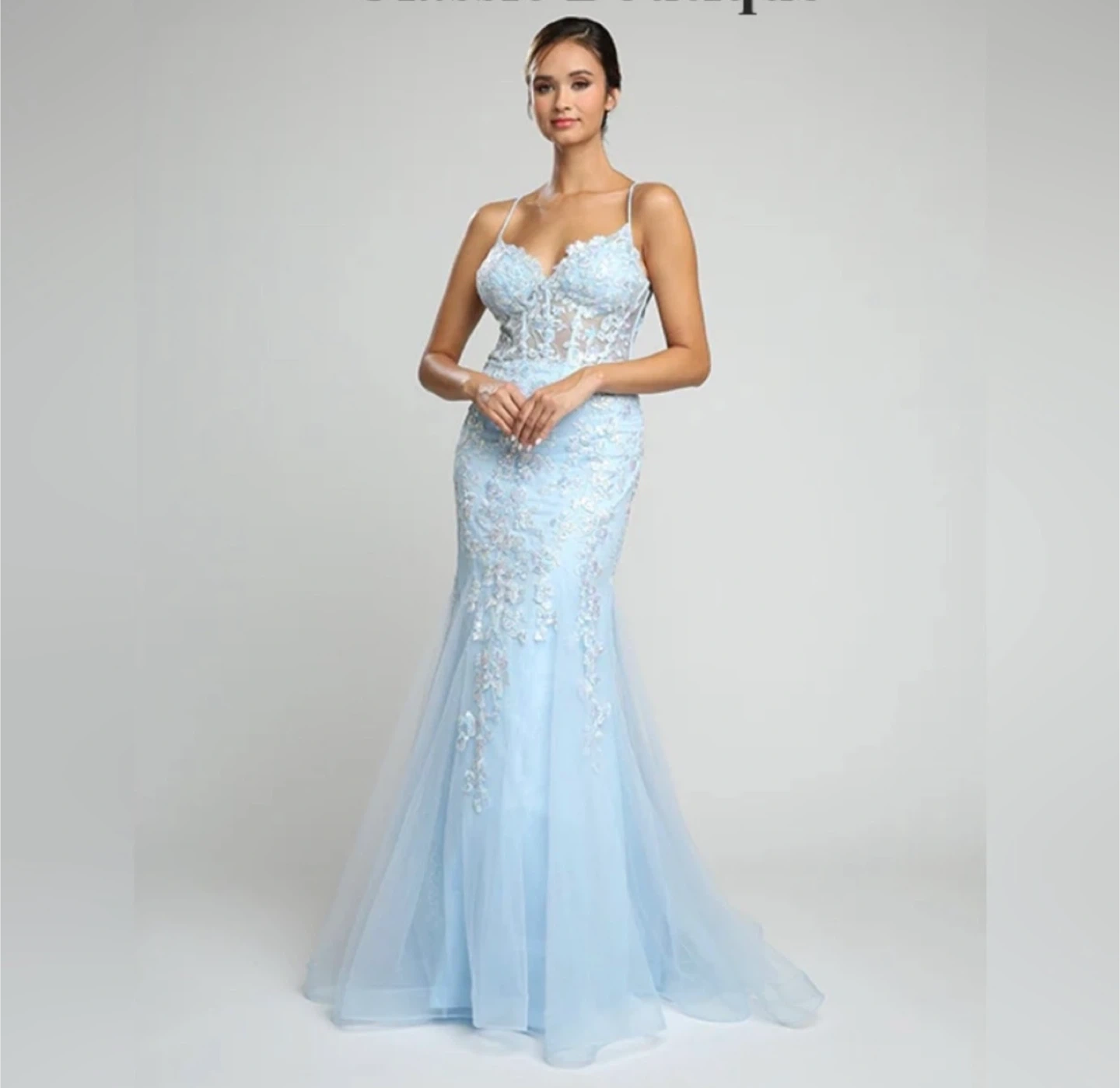 Gorgeous light blue mermaid prom dress with intricate sequin and floral appliques. It features a flattering corset bodice and a delicate criss-cross back detail. This dress is perfect for formal events or a special occasion!