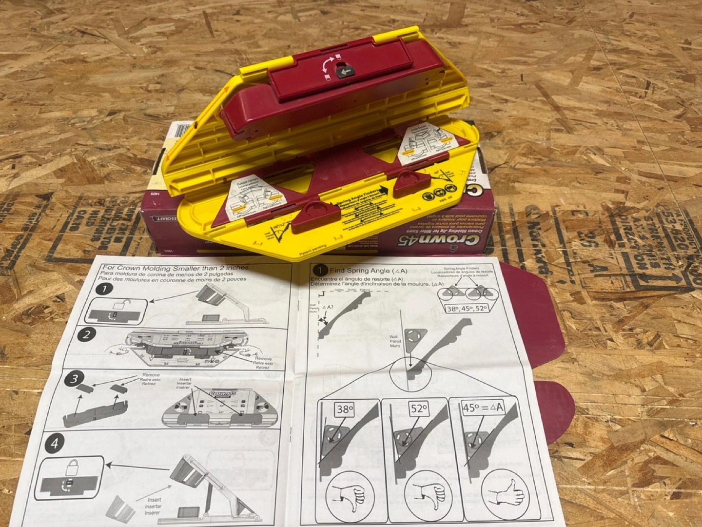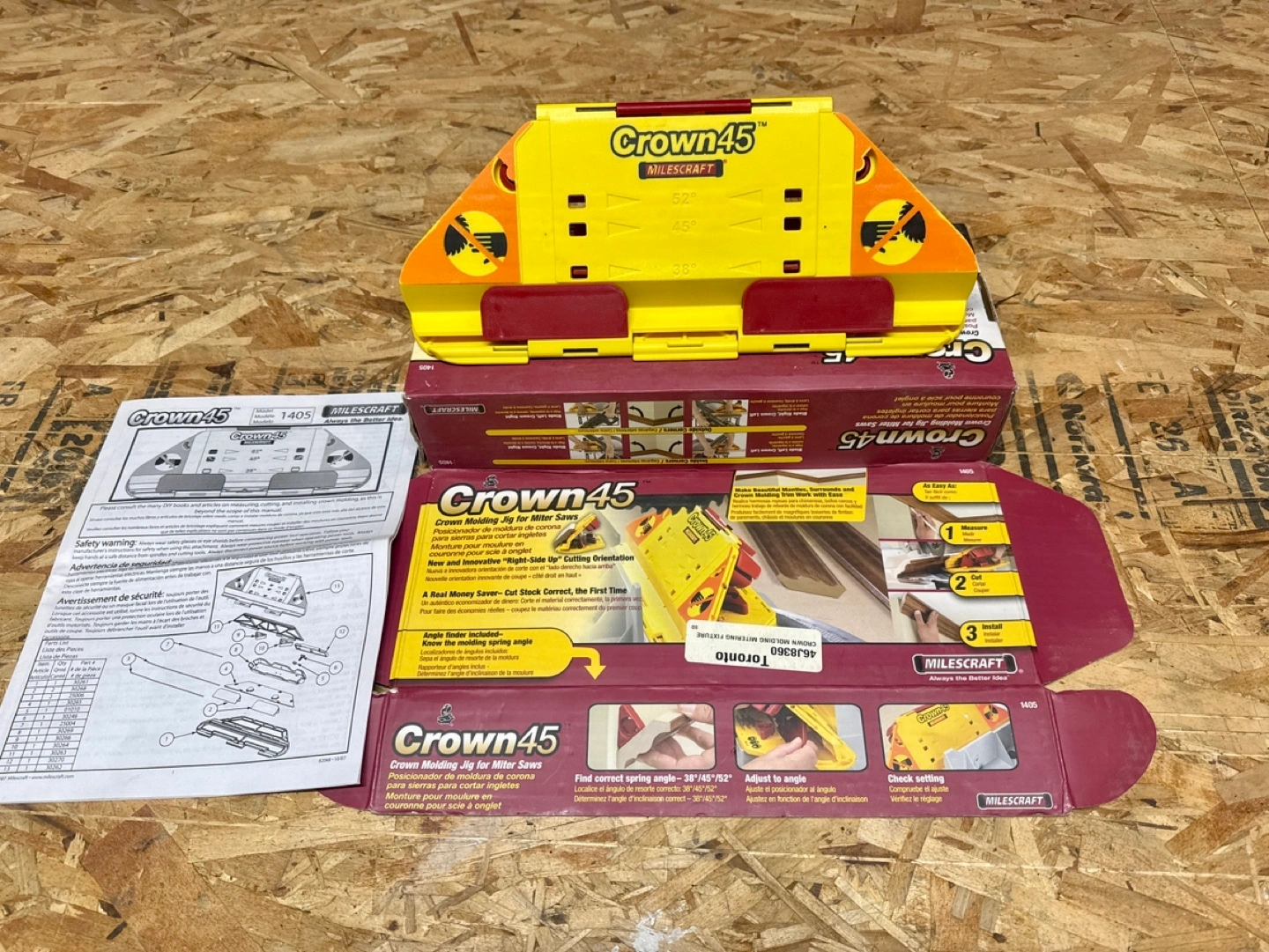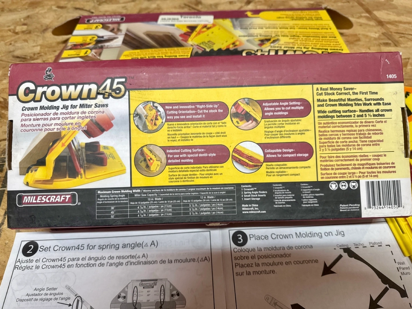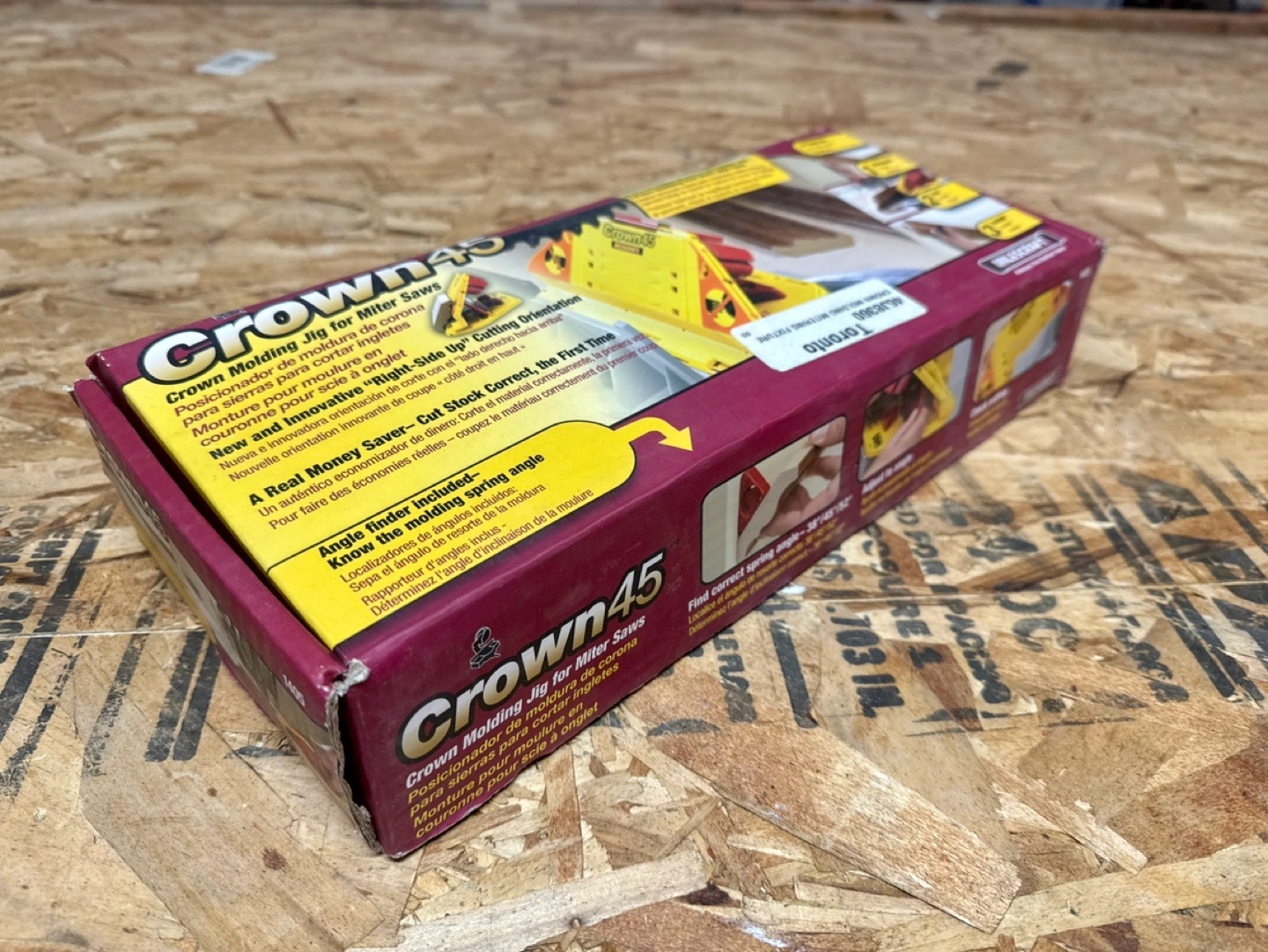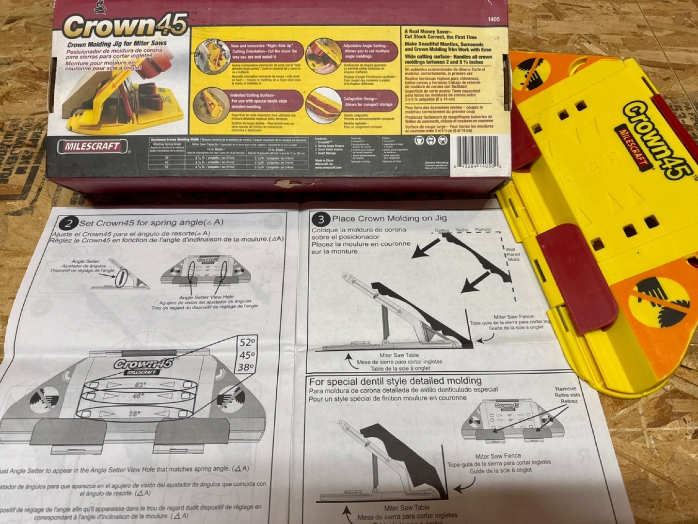 Save time and money by making accurate cuts the first time with the crown molding jig for miter saws. This jig has a right-side-up cutting orientation and is ideal for both novices and professionals. It also has a collapsed design for compact storage and includes angle finders to determine the spring angle of your molding. An indented cutting surface allows you to create dentil-style moldings.