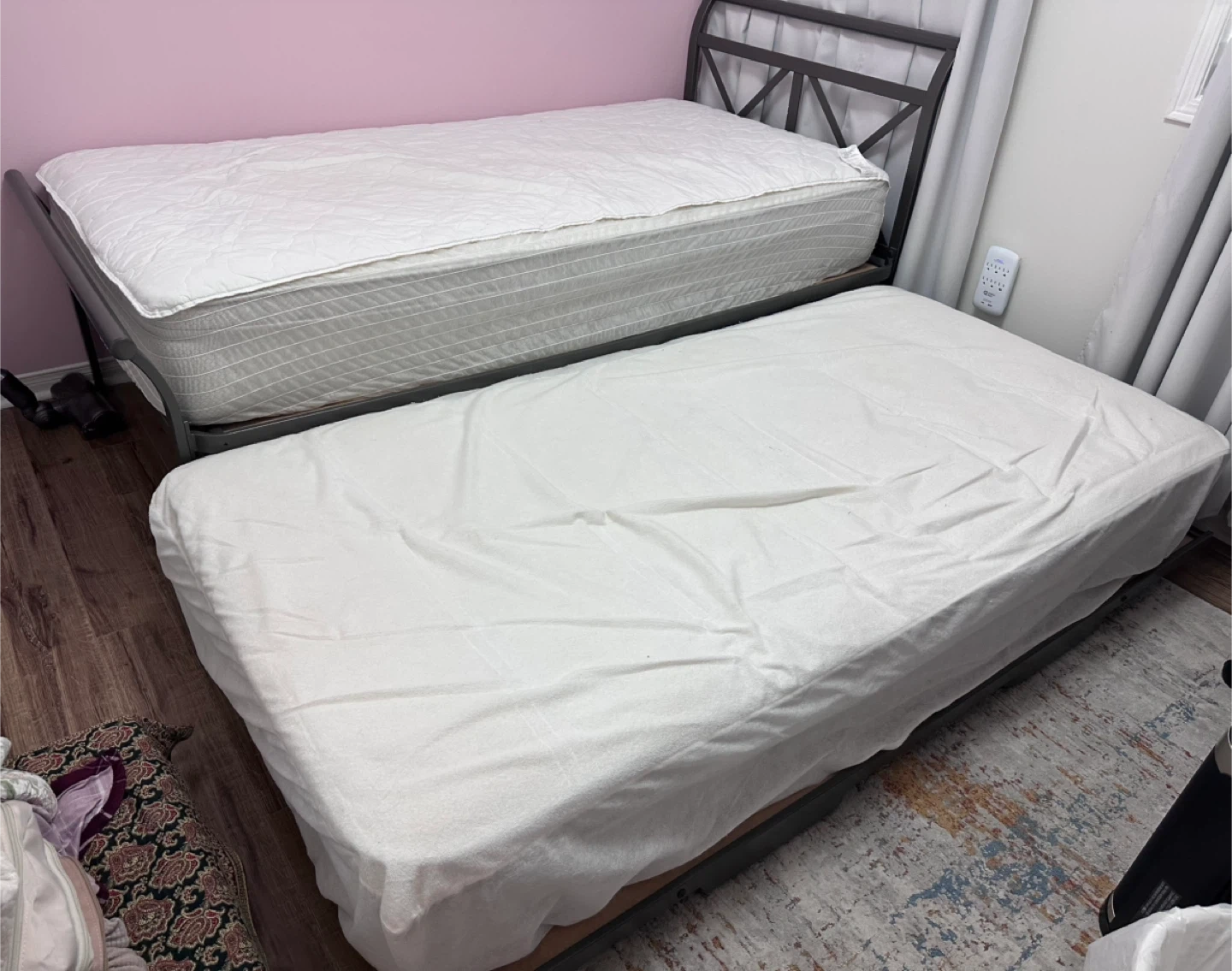 This daybed features a sturdy metal frame and includes a pull-out trundle. It's perfect for saving space in smaller rooms. The mattresses are included.