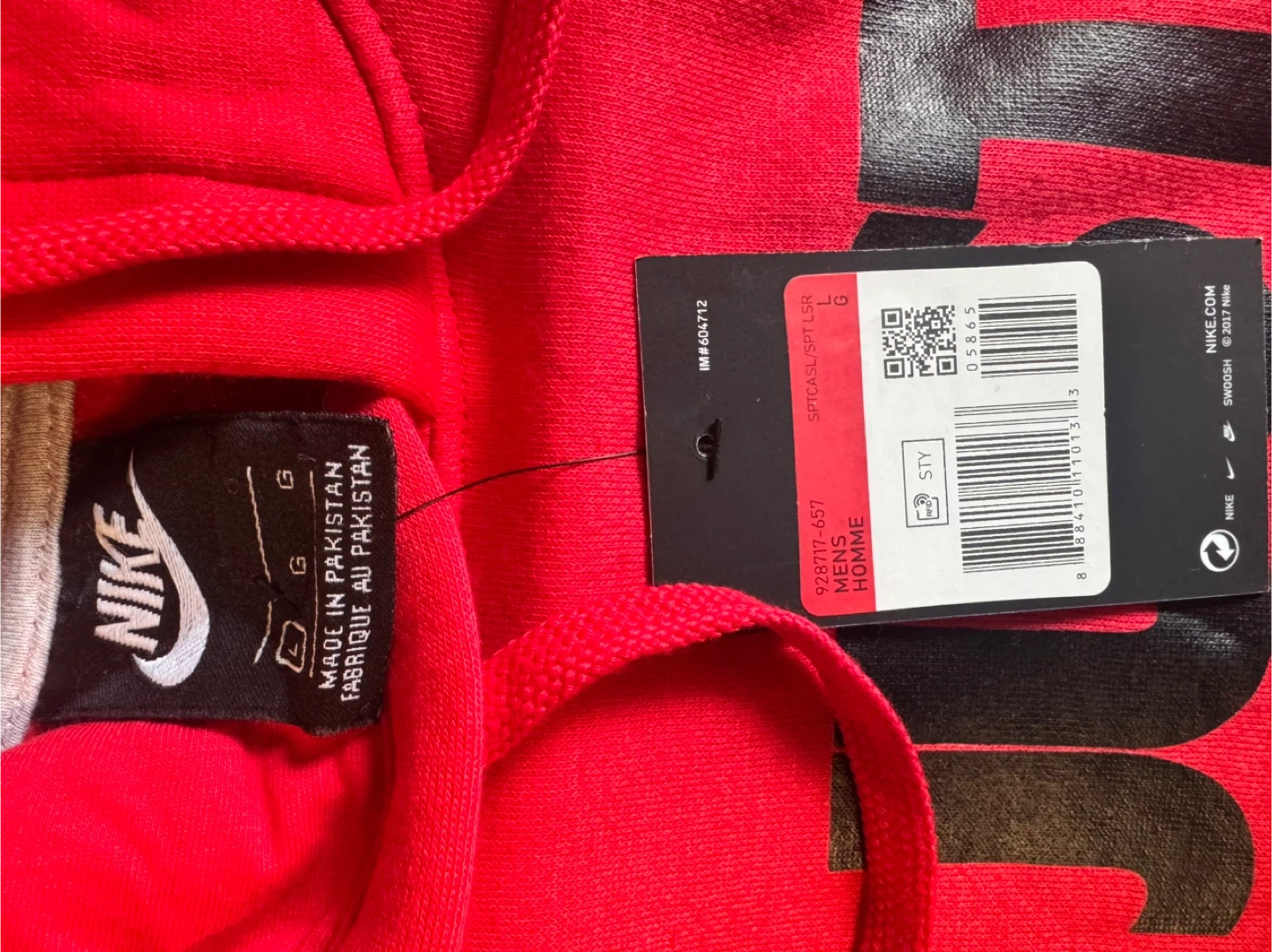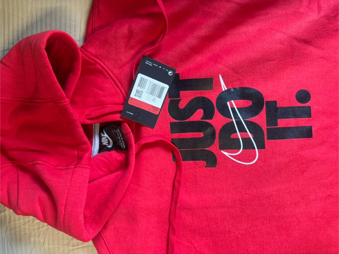 Selling a vibrant red Nike hoodie with the iconic "Just Do It" logo. It's a size large, perfect for staying cozy and stylish. The hoodie is in great condition and ready for a new owner!