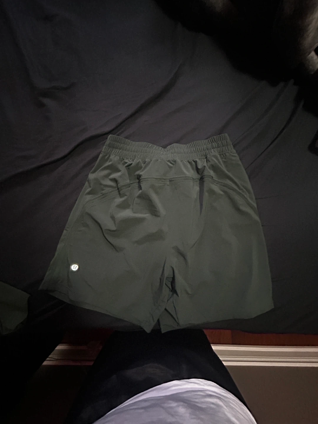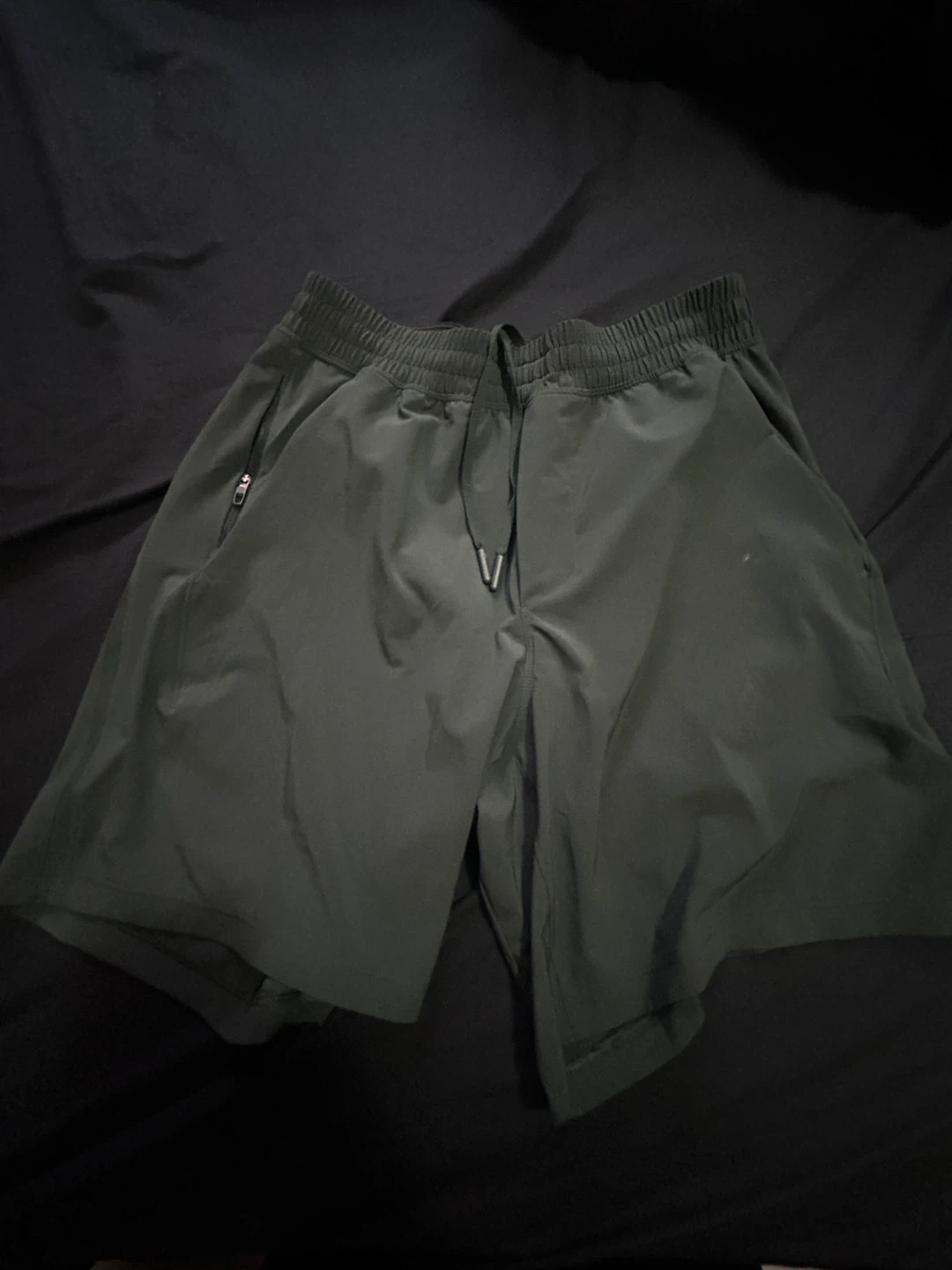 Lululemon athletic set featuring a dark green hooded jacket and matching shorts. Both pieces have the Lululemon logo visible. The jacket is full zip with pockets, and the shorts have an elastic waistband with a drawstring and zippered pockets.