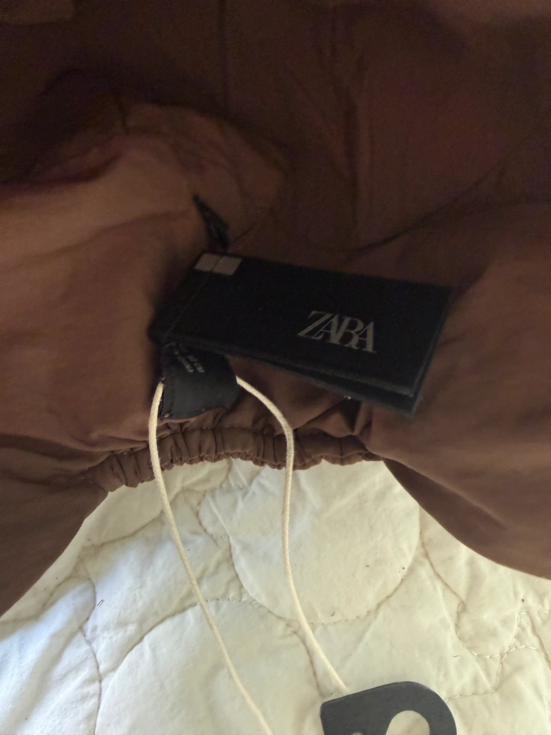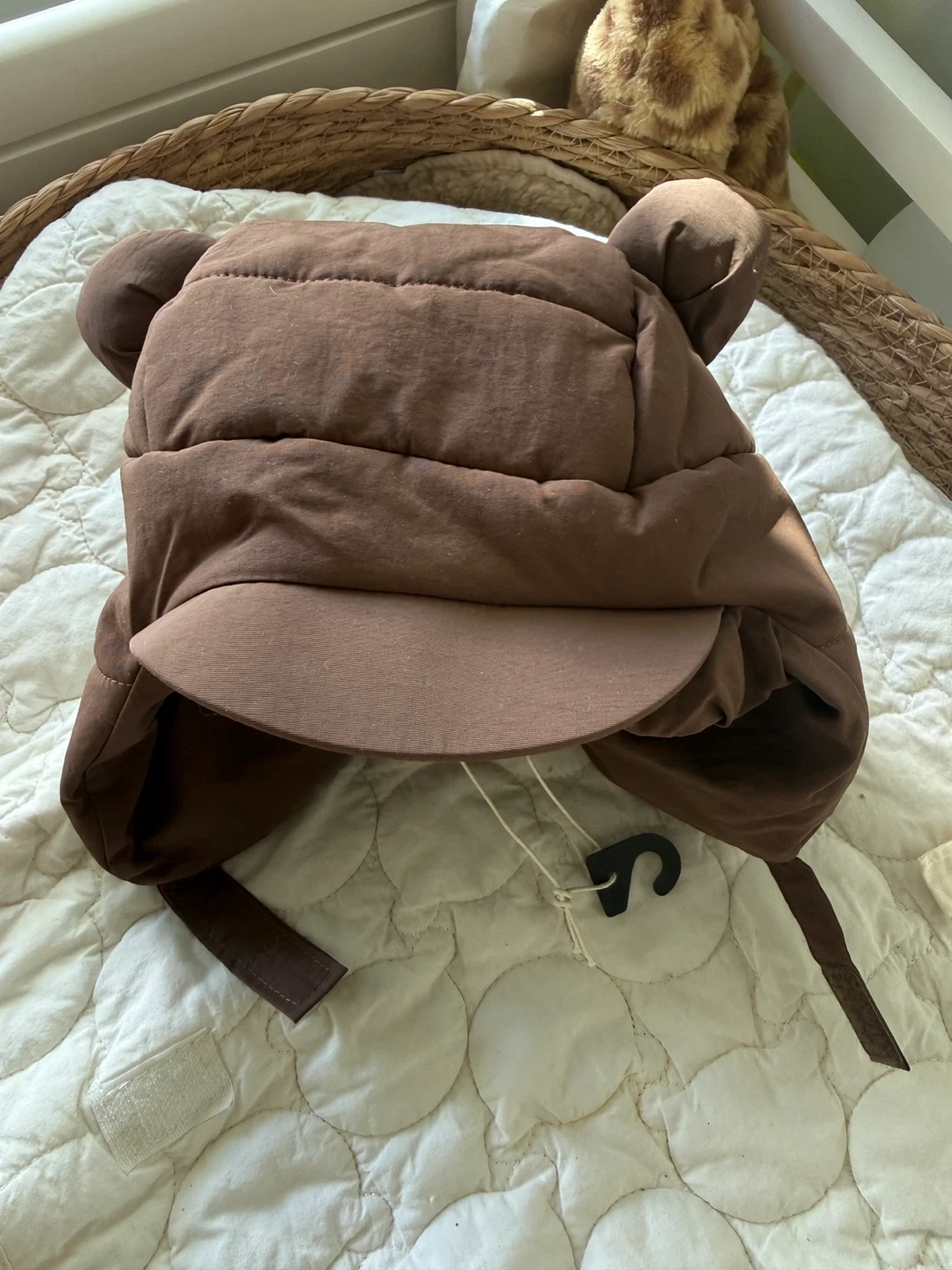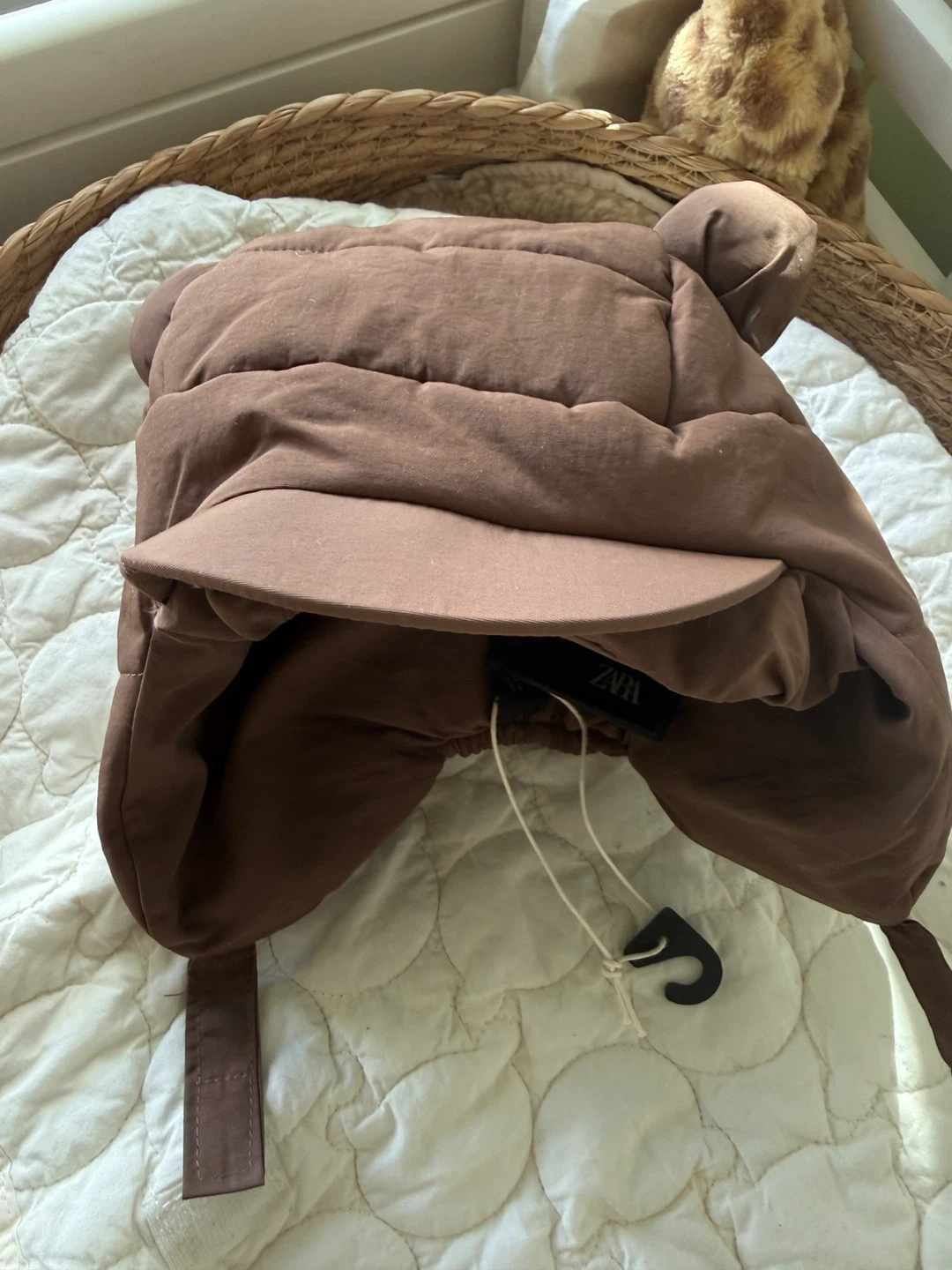 This is a Zara puffer hat in a warm brown colour. It features cute bear-ear details on top and ear flaps for extra warmth. The hat has a drawstring closure to help keep it secure.