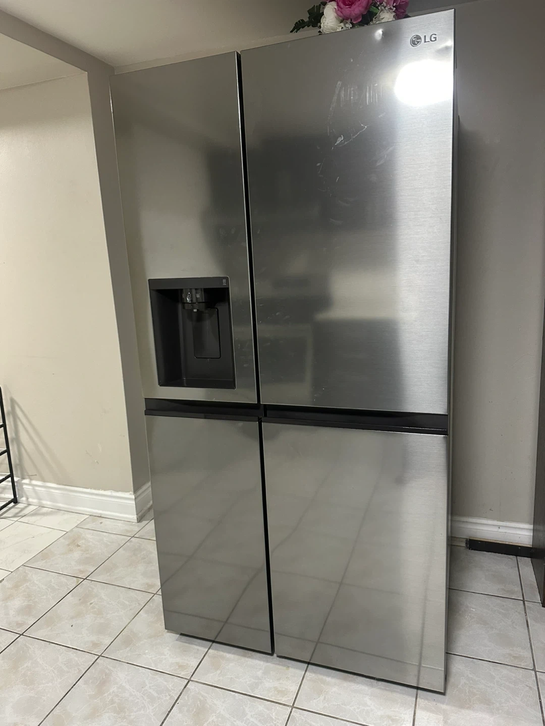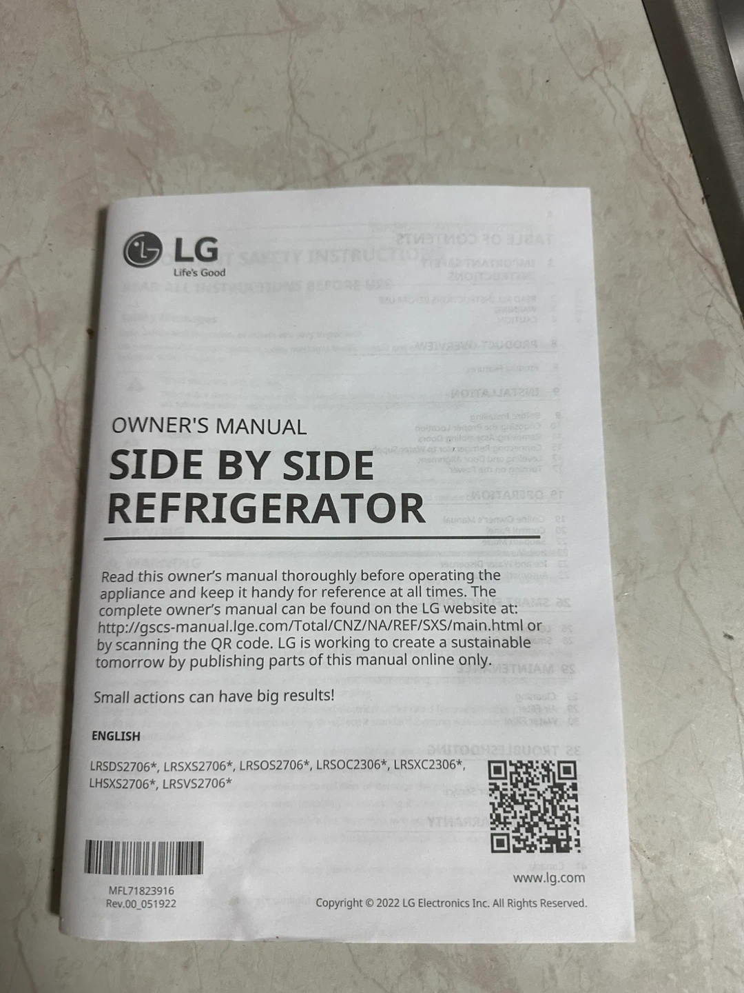 LG stainless steel side-by-side refrigerator. It features multiple air flow for even cooling and an external ice and water dispenser. Comes with the owner's manual.