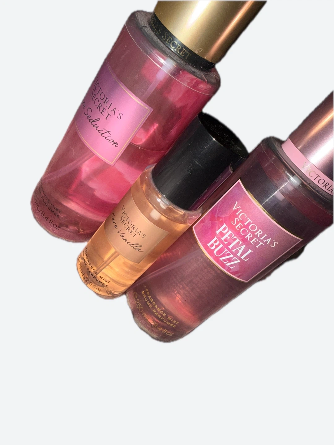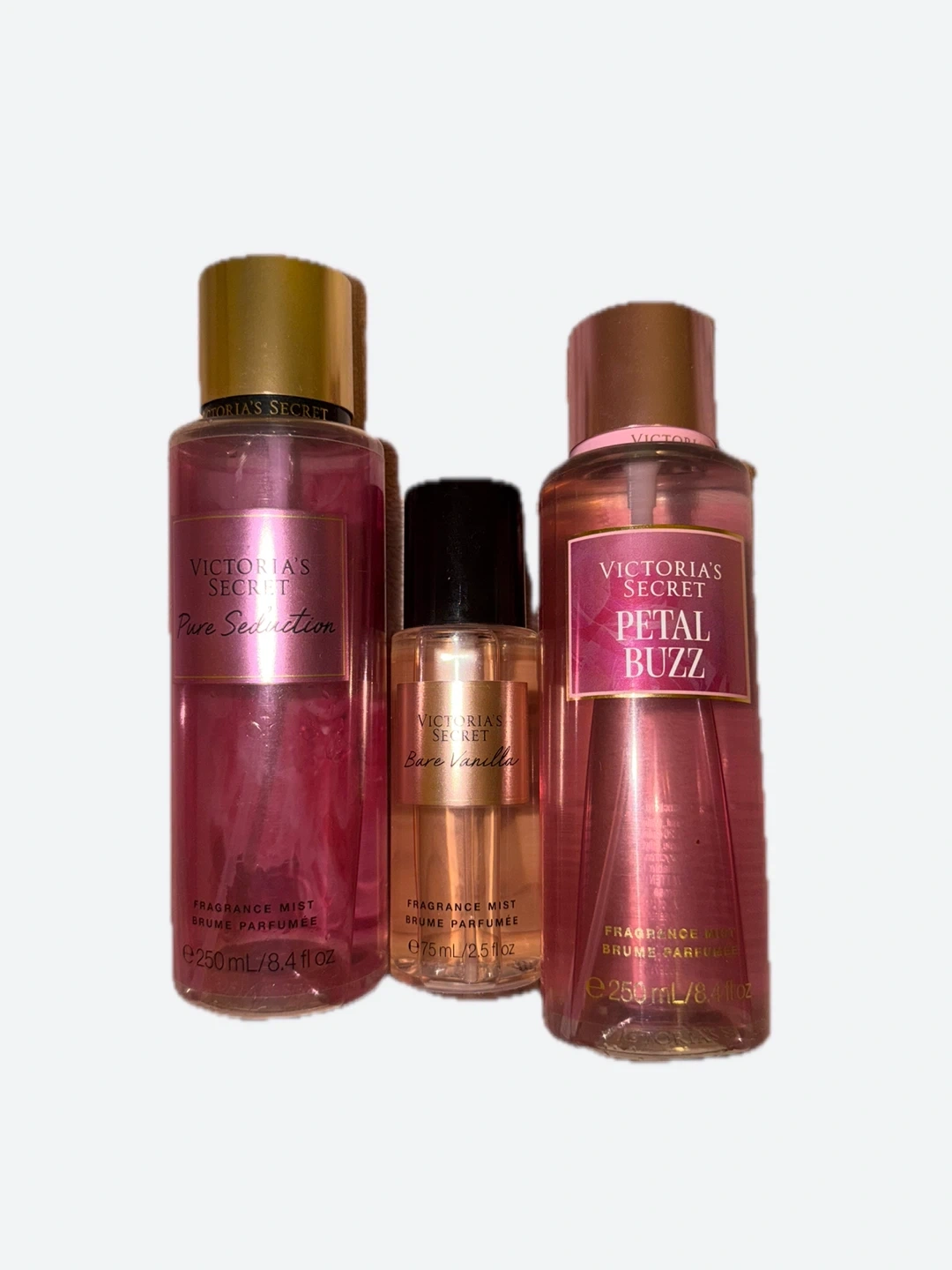 Set of three Victoria's Secret fragrance mists. Includes Pure Seduction, Bare Vanilla, and Petal Buzz. Pure Seduction is half used! They smell amazing, I just got too many perfumes and mists so I don’t need those three anymore.