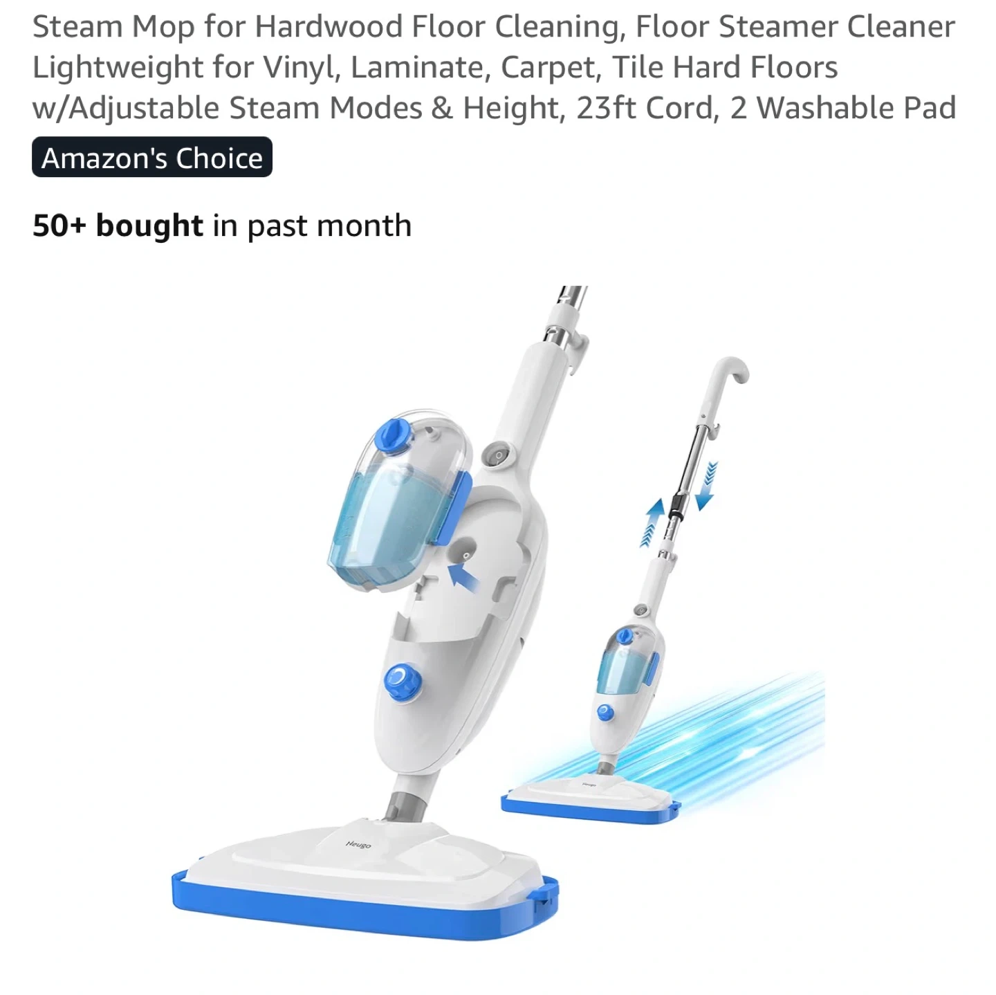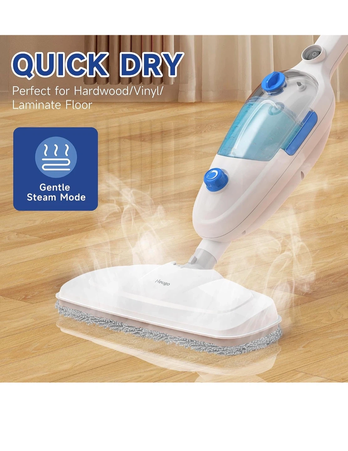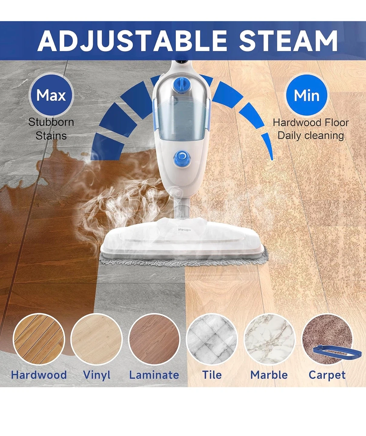This steam mop effectively cleans hardwood, vinyl, laminate, tile, marble, and carpet floors. It features adjustable steam settings and a 15.2 oz removable tank for extended cleaning. The quick-dry function is perfect for hardwood, vinyl, and laminate.
