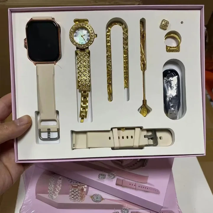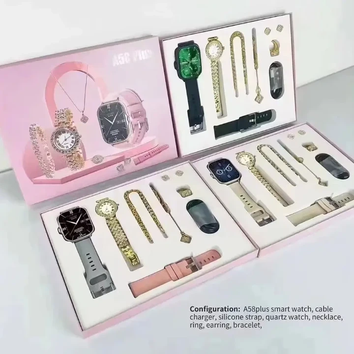 This A58 Plus smart watch set includes a smart watch, quartz watch, necklace, bracelet, ring, and earrings. It also comes with a cable charger and silicone strap. Multiple strap colours are available.