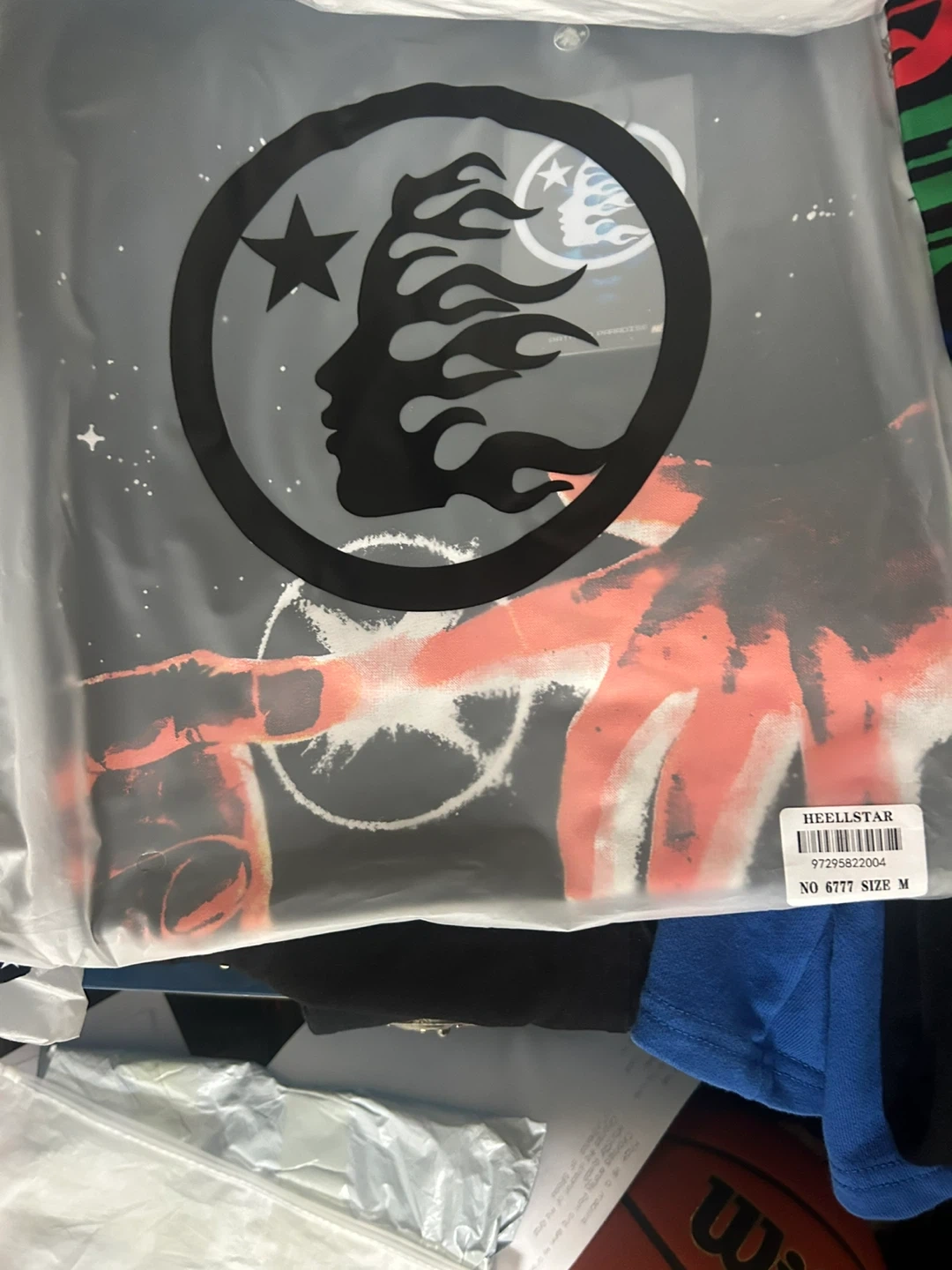 This HELLSTAR t-shirt features a black wash with a striking P2P graphic on the front and a large HELLSTAR logo on the back. It's made of cotton material. Comes in a size medium.