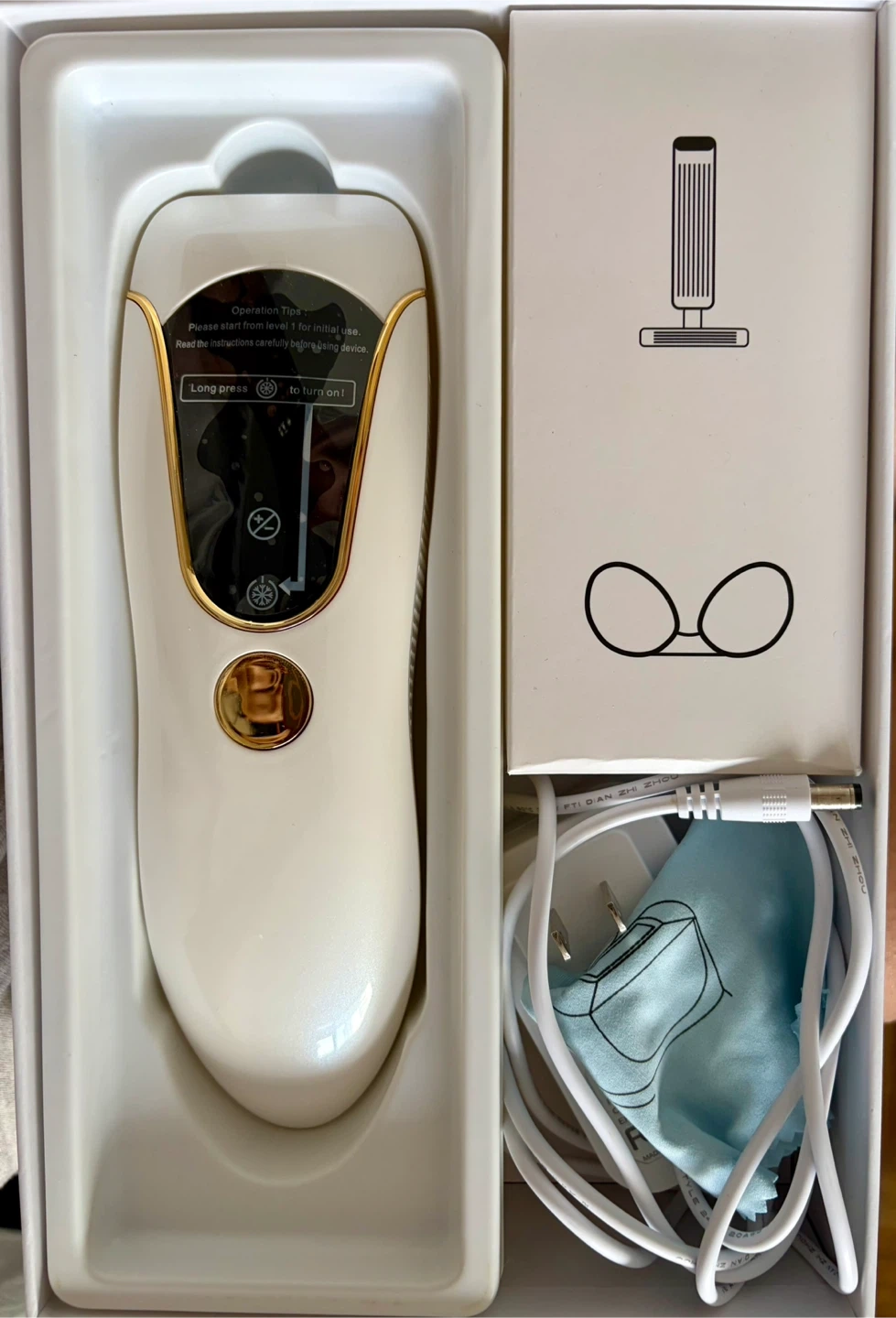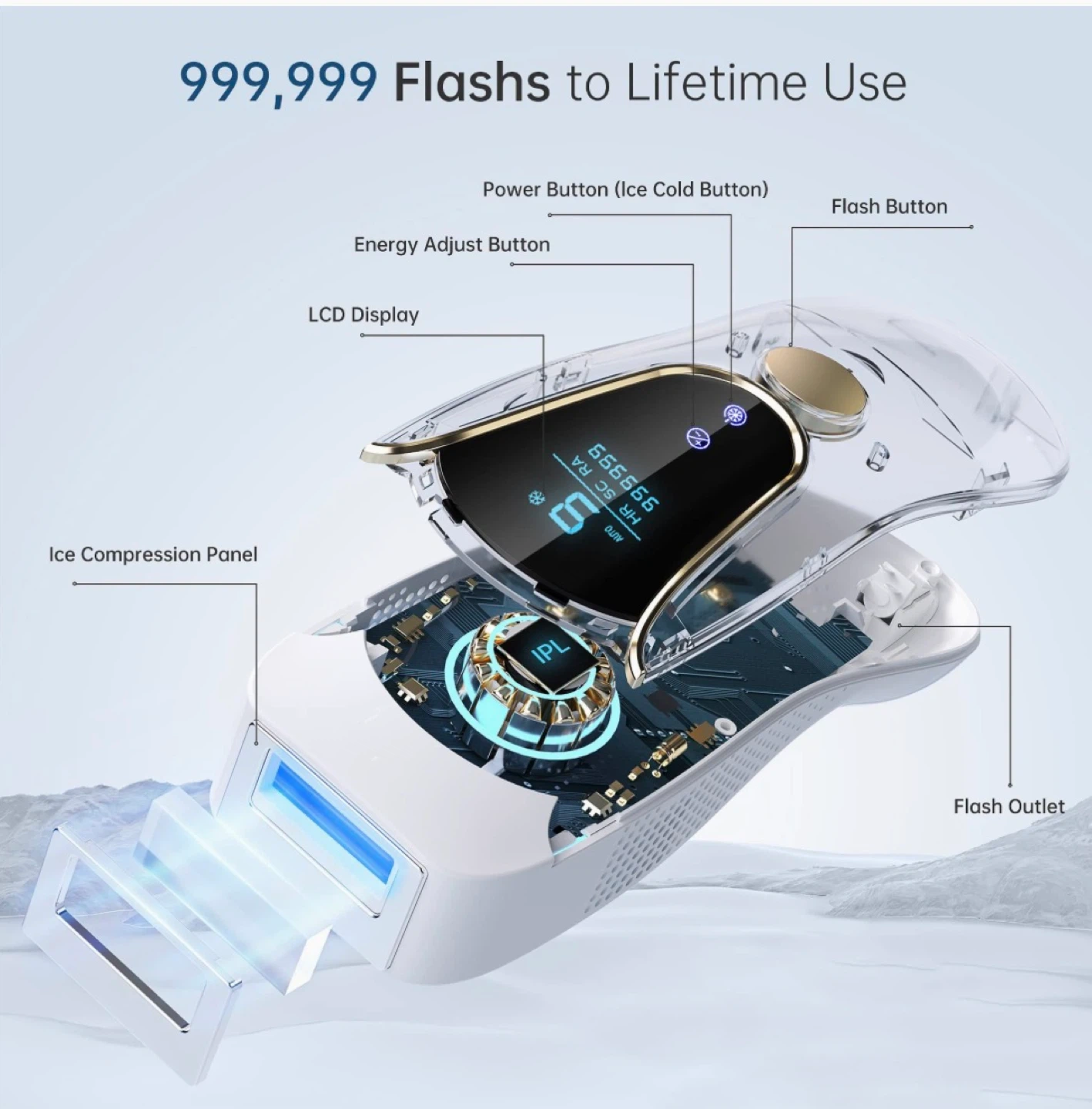 This is the ARTOLF ICE BEAUTY hand-held IPL device. It offers 999,999 flashes for lifetime use and features an LCD display and an ice compression panel.