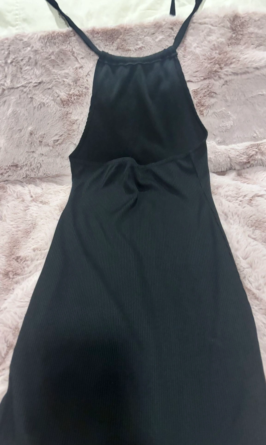 Simple, sexy, and effortlessly flattering. This black ribbed dress is a perfect minimalist staple with a subtle sultry edge. Size Small. Soft ribbed fabric. Half open back for a sexy, modern look. Lightweight & breathable. Body-skimming silhouette. Slips on easily. No label (brand unknown). Perfect for a night out, vacation, date night, or layering with a jacket or cardigan. Dress it up with heels or keep it casual with sandals. Excellent pre-owned condition.