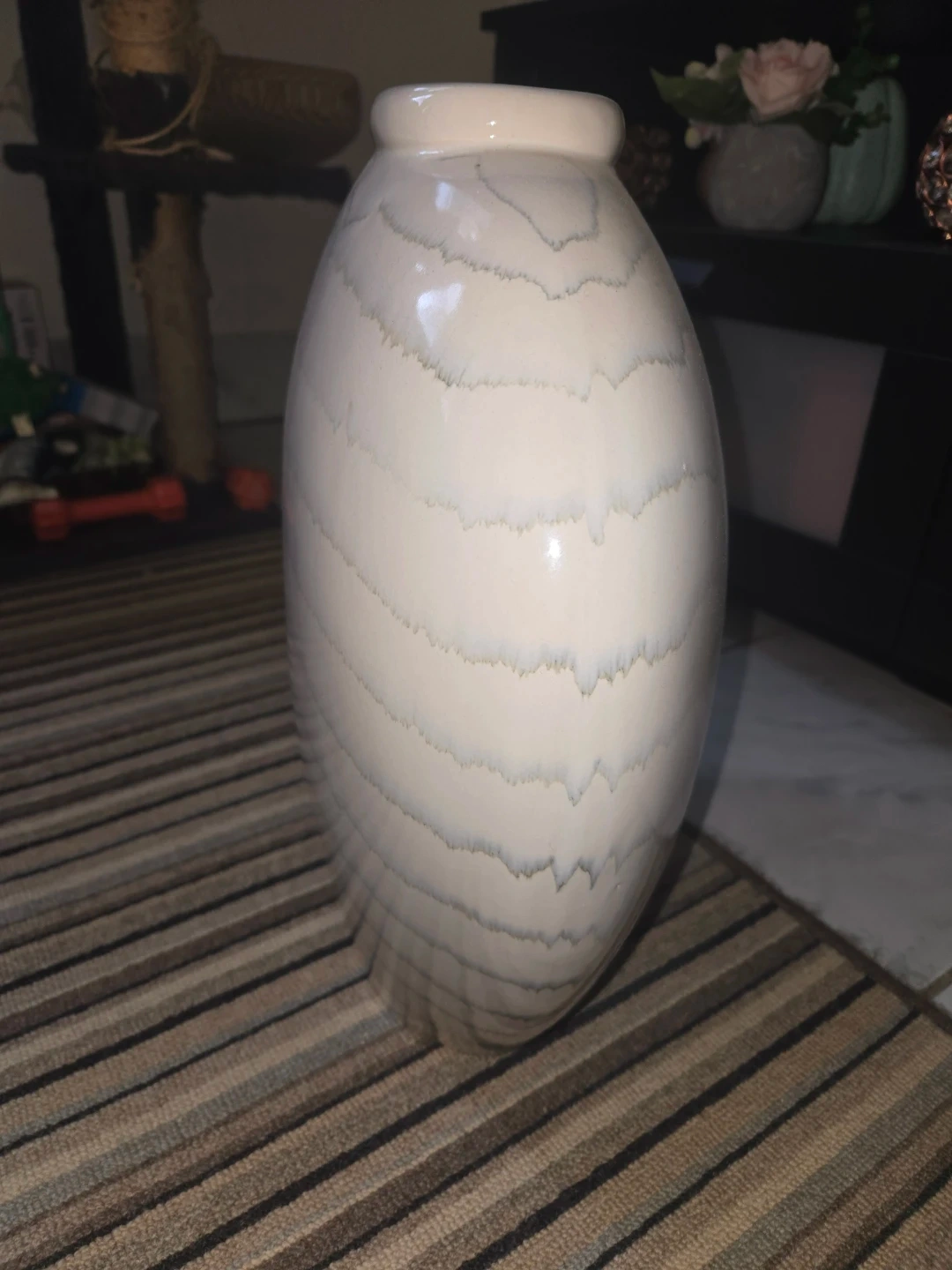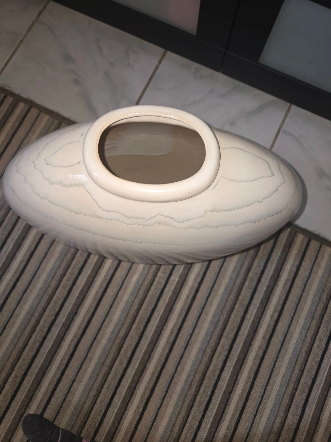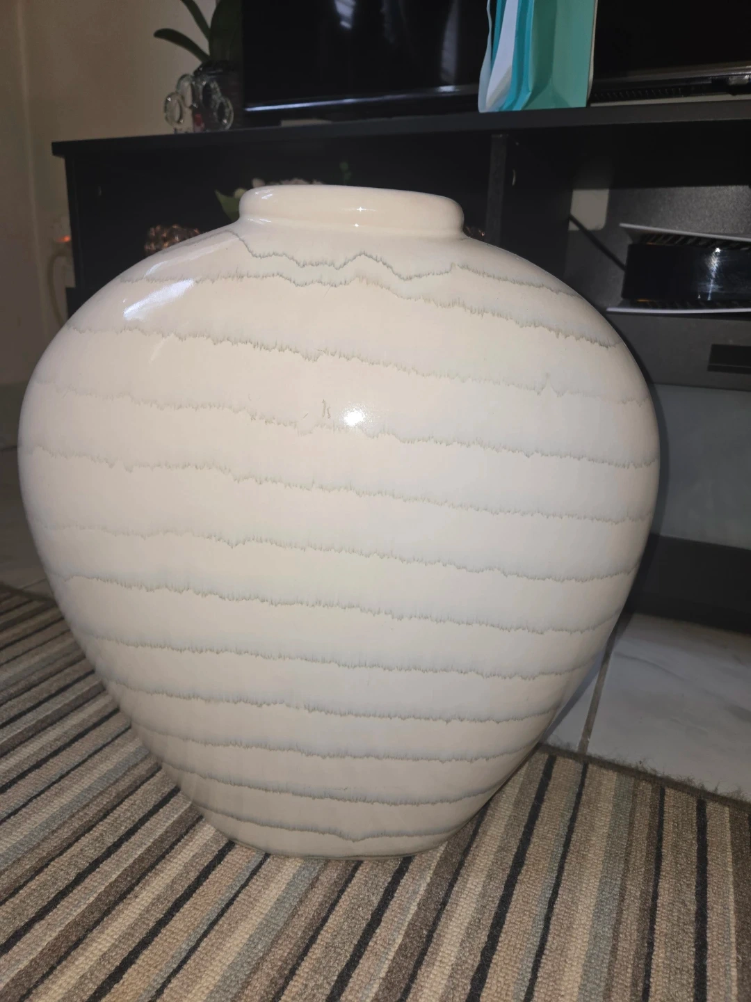 large, off-white, ribbed ceramic vase.