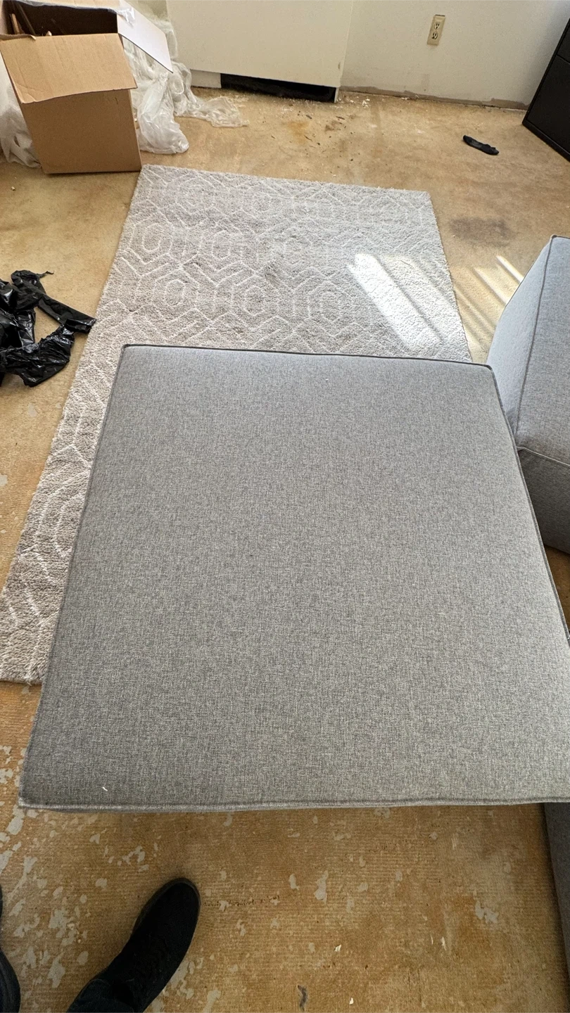 Selling a set of three grey square ottomans. They're in good condition and would be a great addition to any living space! The colour is a neutral grey, so they'll match almost any decor