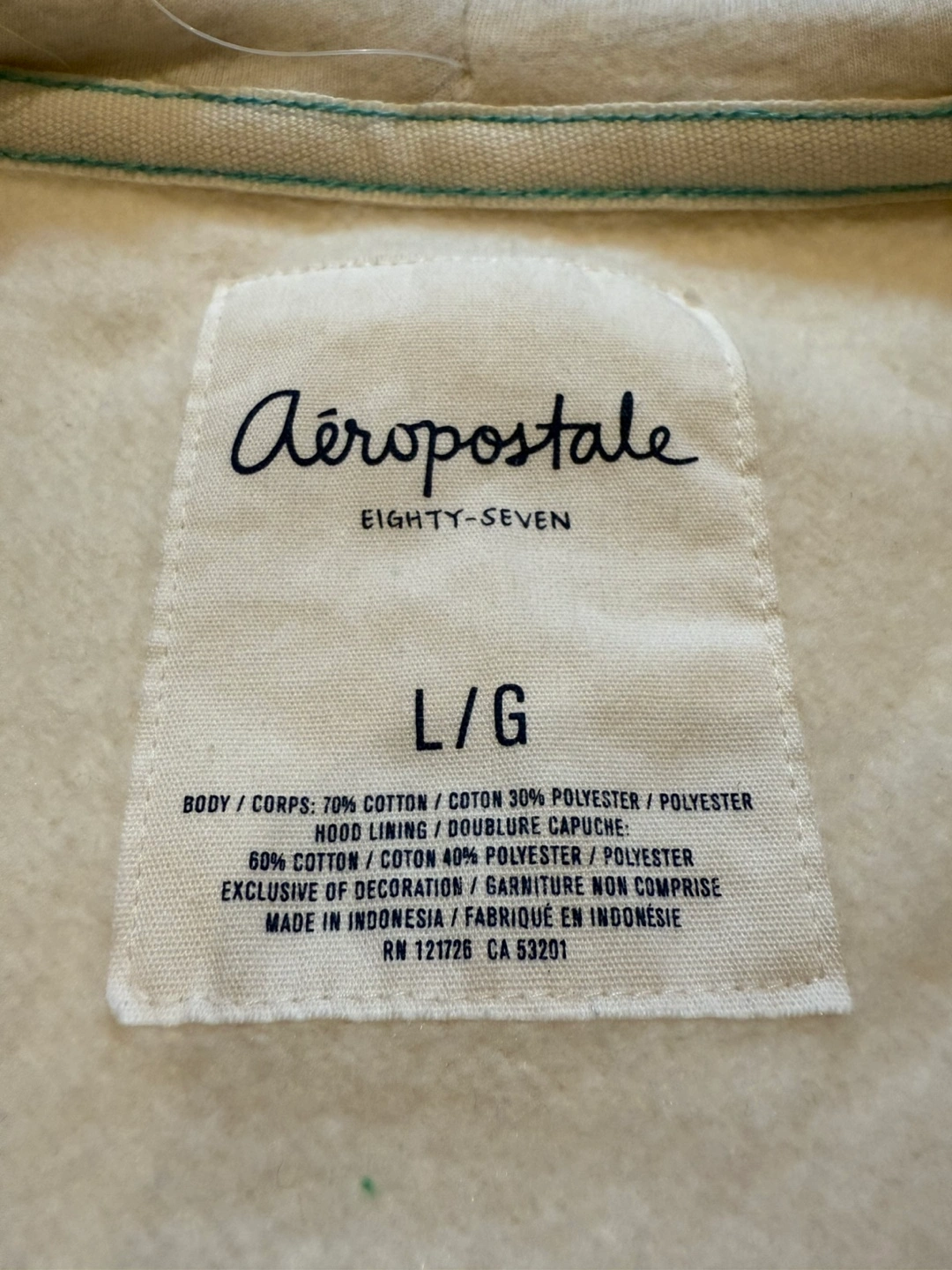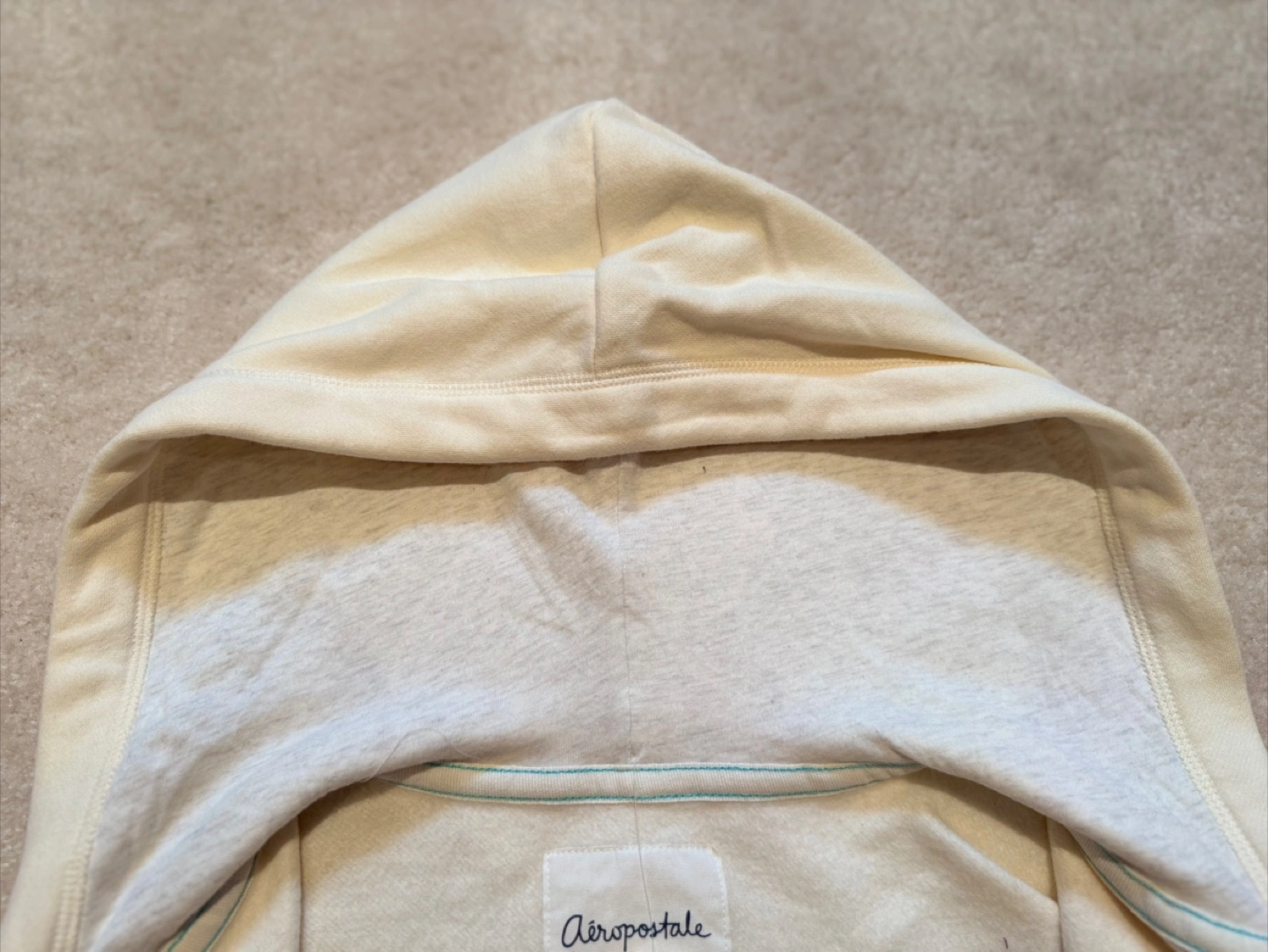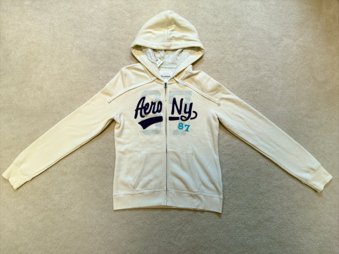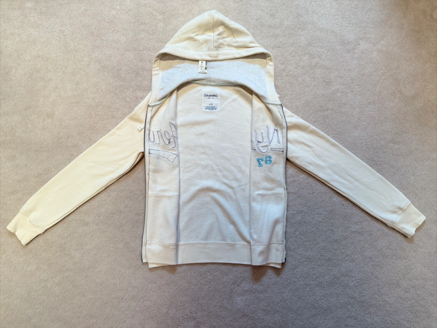 Cozy Aeropostale full zip hoodie in a cream colour! It's a size large. The inner hoodie is a light shade of grey that gives a nice contrast to the creamy colour of the hoodie. Made of 70% cotton and 30% polyester, so it's comfy and easy to care for.