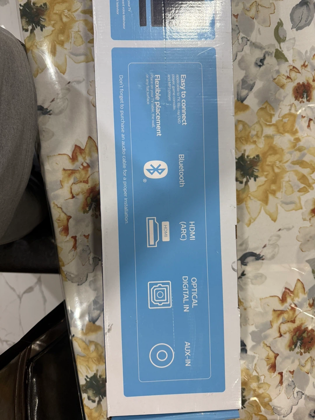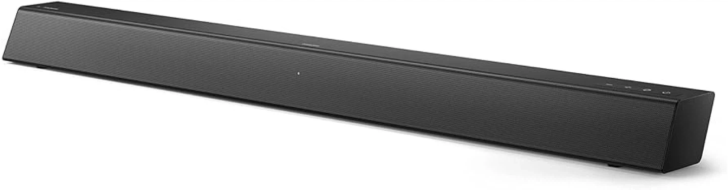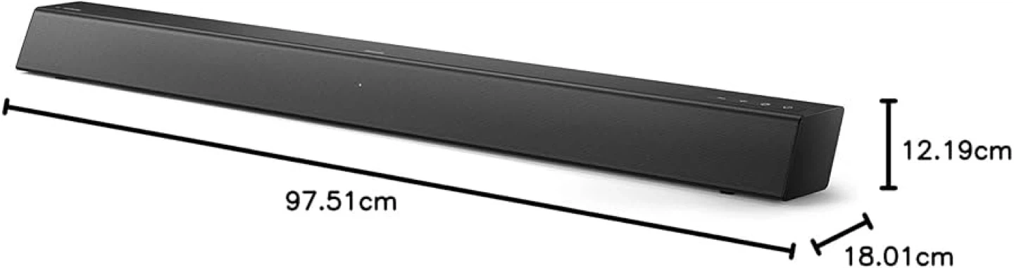 This Philips soundbar provides enhanced audio for your TV. It's easy to connect via Bluetooth, HDMI (ARC), Optical, or Aux-in. The soundbar measures 97.51cm in length, 18.01cm in width, and 12.19cm in height. It's designed for flexible placement on a TV stand or wall.