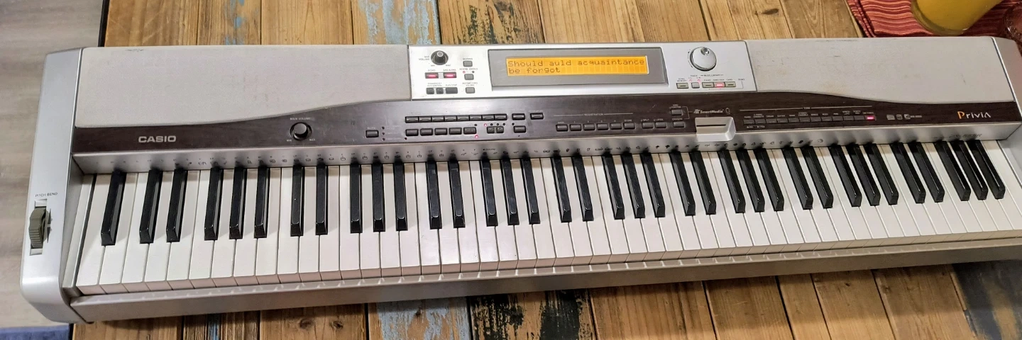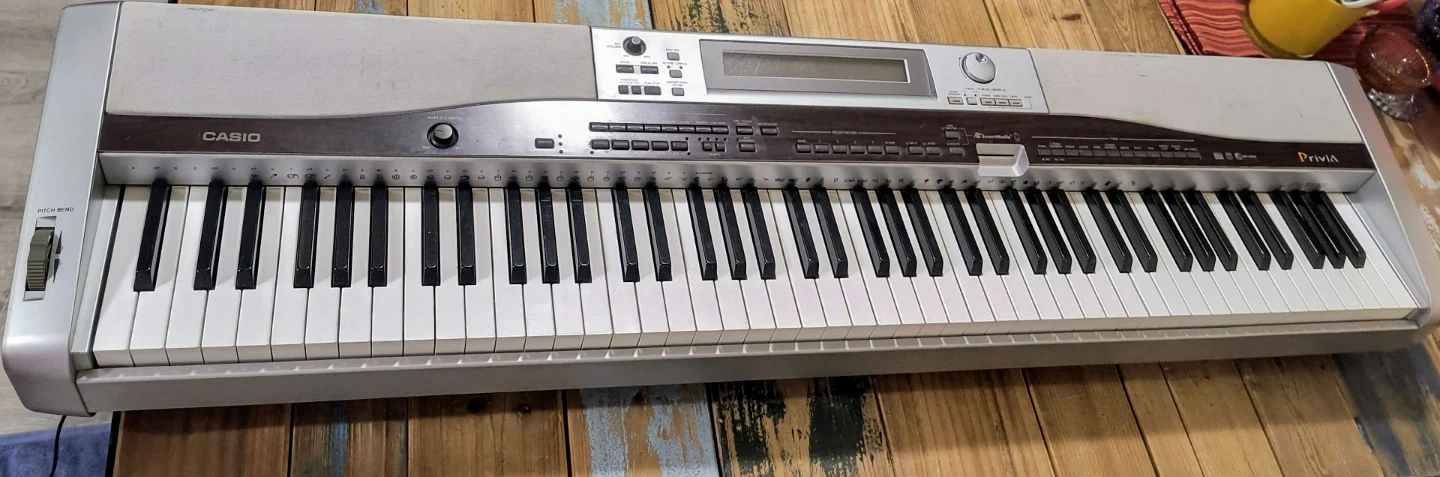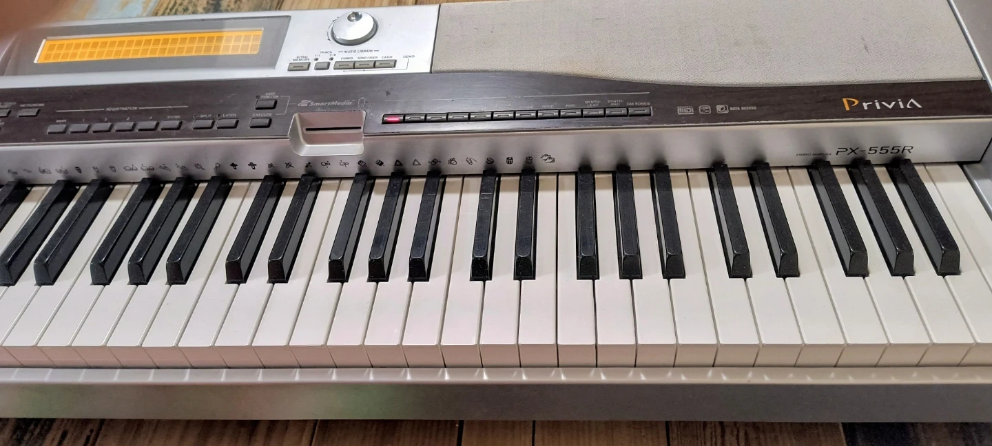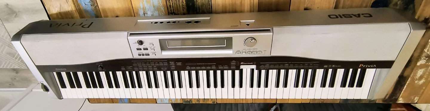This is a Casio Privia PX-555R digital piano. It's silver and features 88 full weighted keys. Includes power adapter.