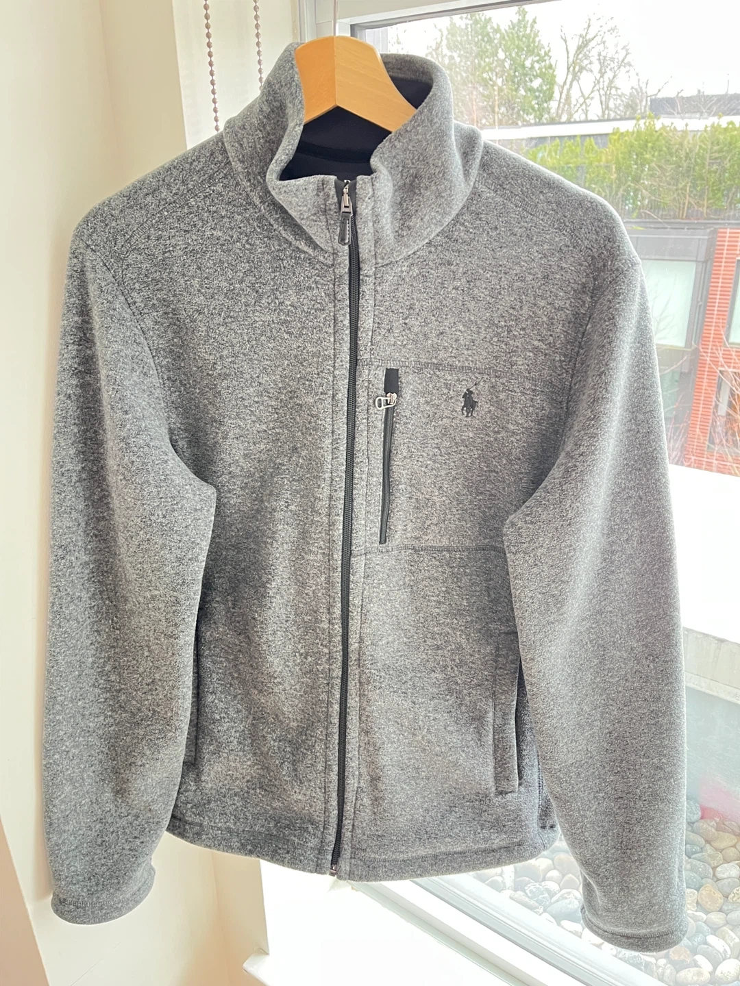 Polo Ralph Lauren performance fleece jacket in heather grey. It's a size small with a full zip closure and two side pockets. Features a zippered chest pocket as well. Slightly used basically new.