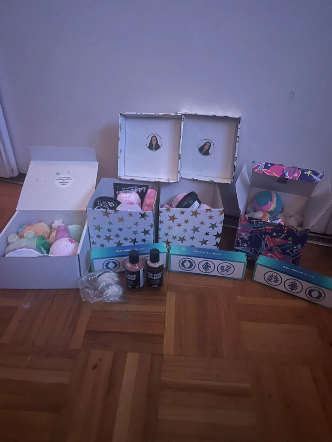 A collection of LUSH bath bombs and lotions. Includes assorted bath bombs in various colours and scents. Also contains two bottles of LUSH lotions. Some items come in gift boxes.