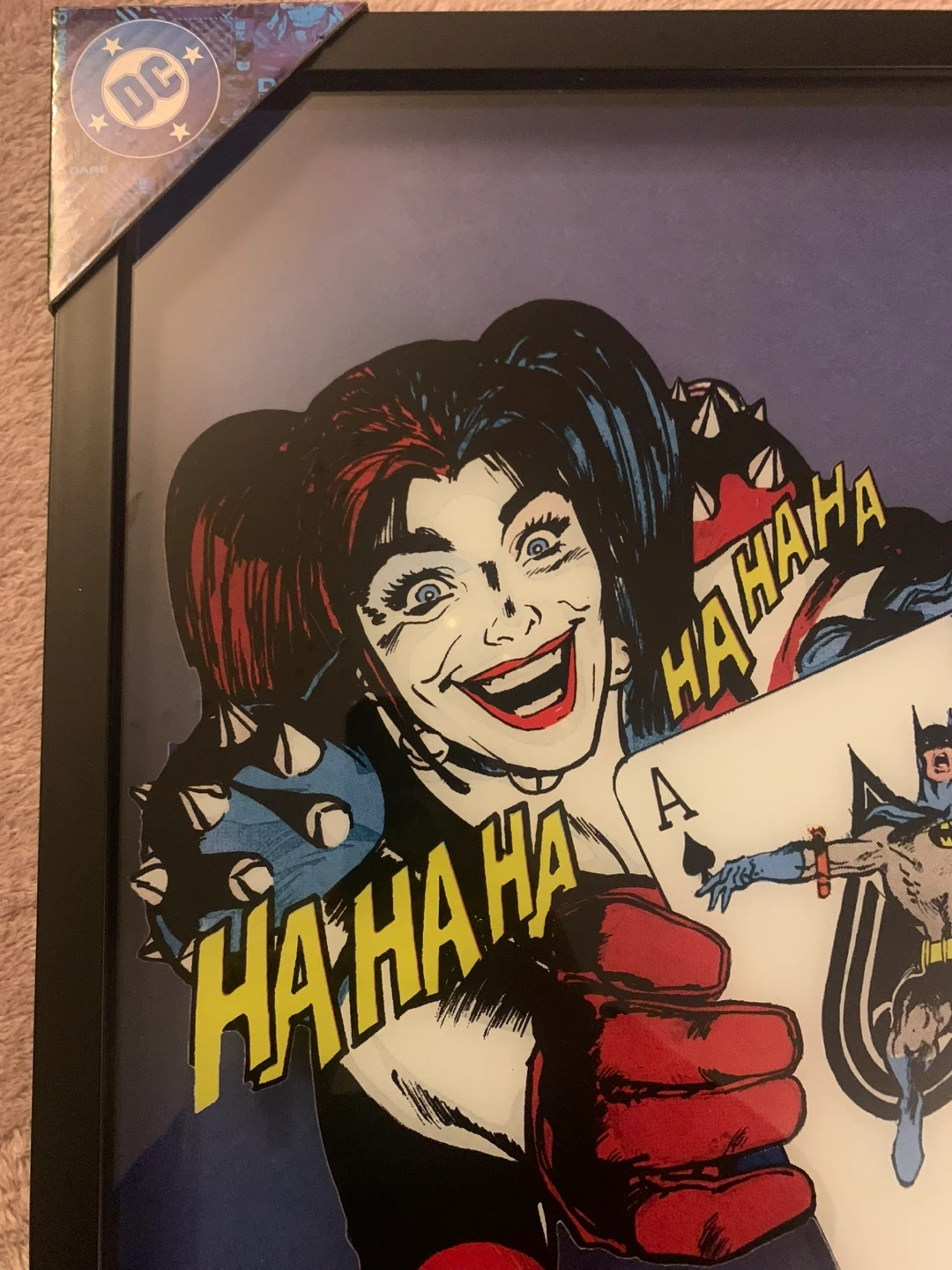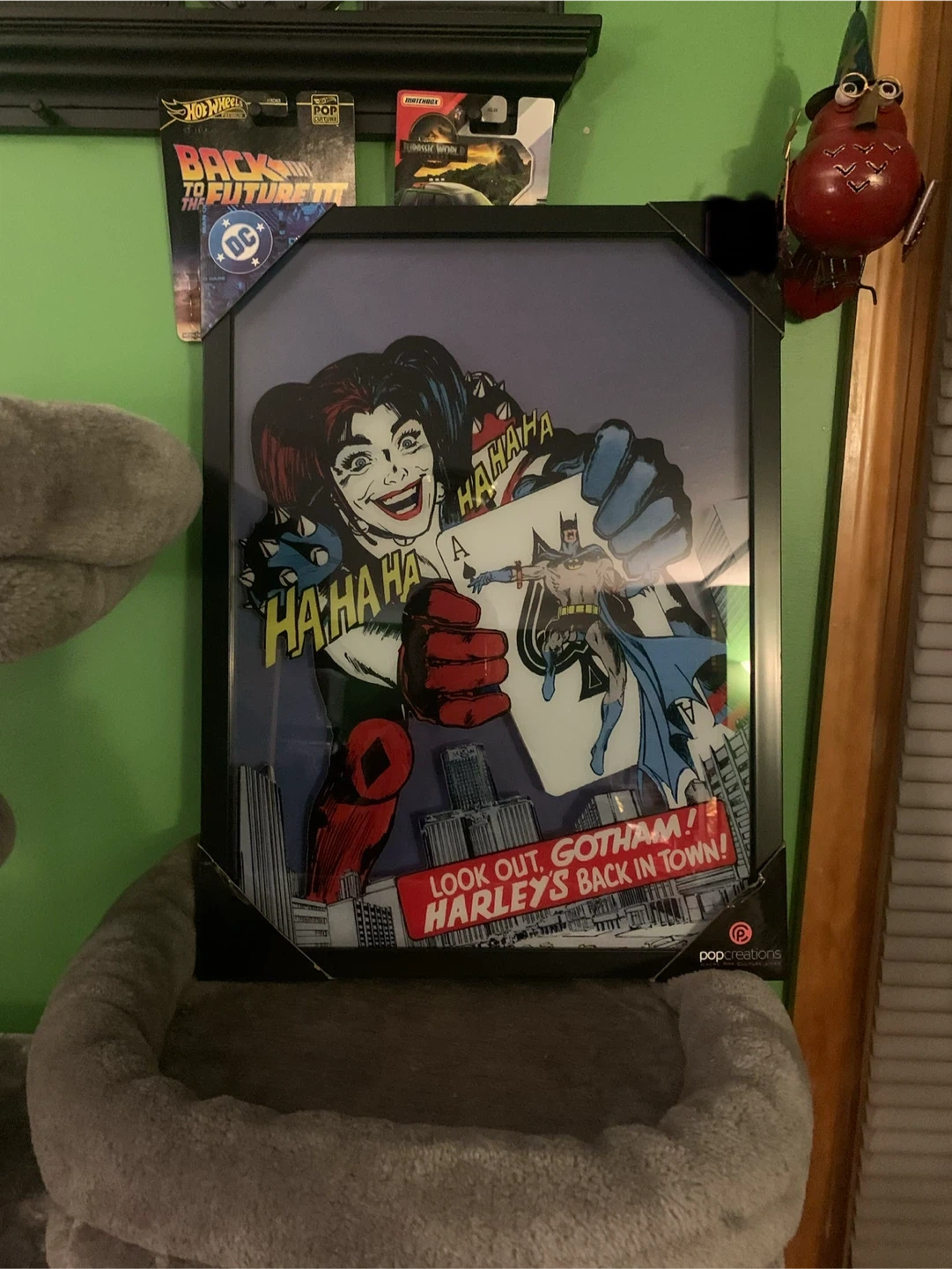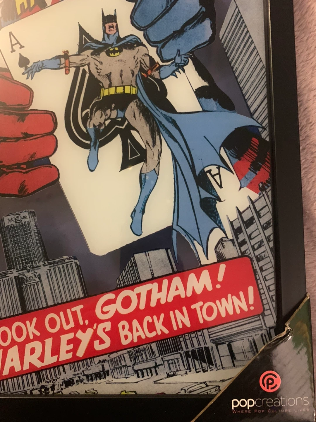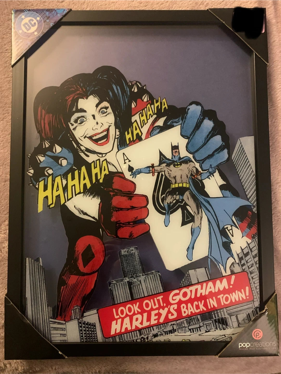 Framed comic art featuring Harley Quinn and Batman. Text reads "LOOK OUT, GOTHAM! HARLEY'S BACK IN TOWN!". Made by popCreations.