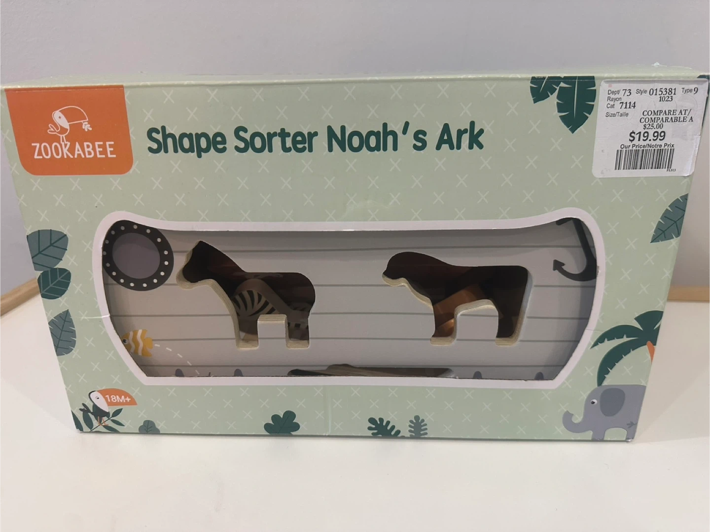 This Zookabee Noah's Ark shape sorter comes with the ark and 12 wooden animal pieces. It's recommended for ages 18 months and up. Great for developing fine motor skills!