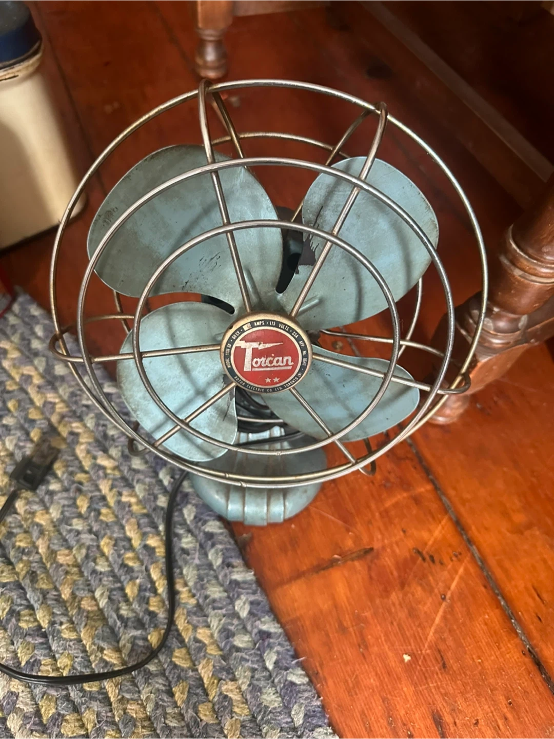Vintage Torcan electric fan with a light blue body and metal grille. It runs on 115 volts. This fan provides a steady breeze for any room.
