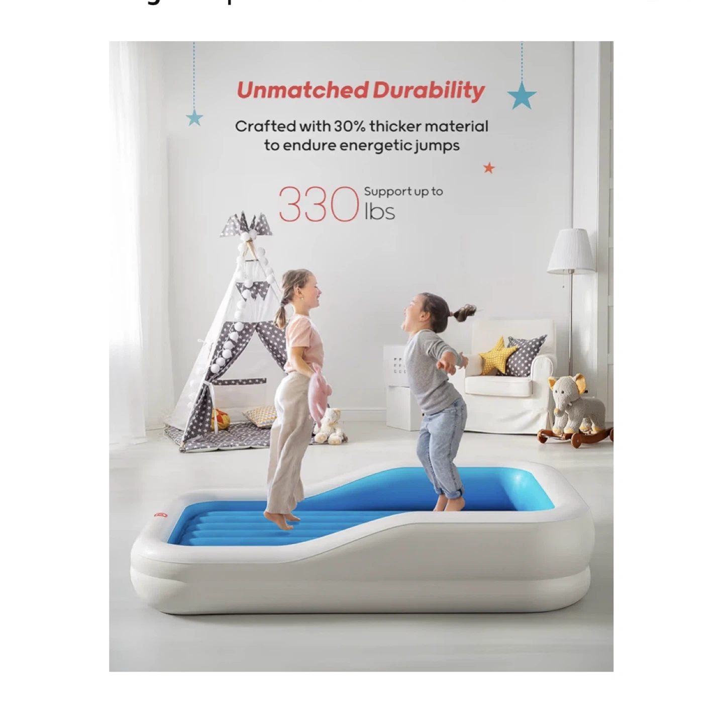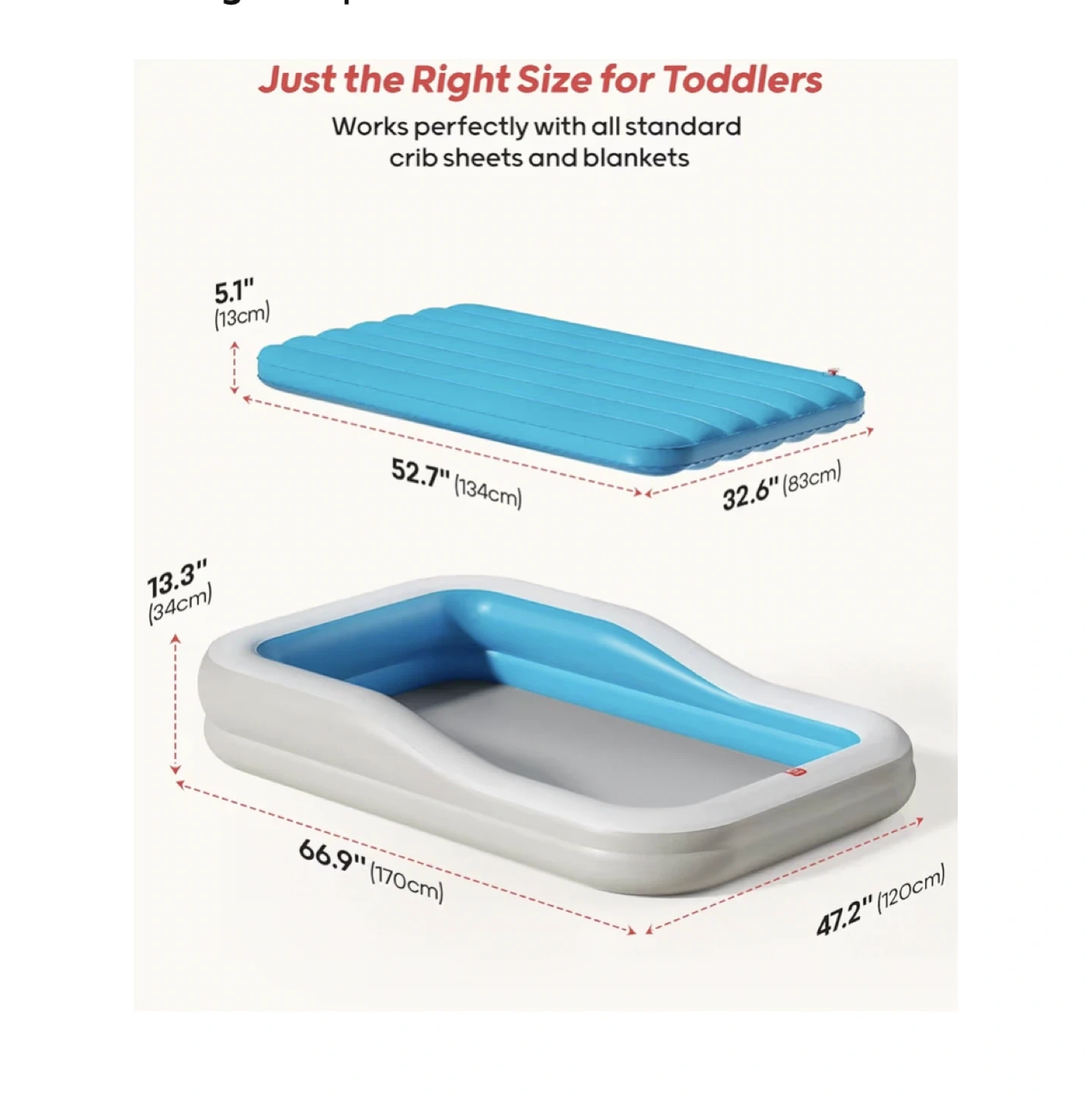 This portable inflatable bed is perfect for toddlers. It's designed for comfort and safety with durable, kid-safe materials. Works with standard crib sheets and blankets.
