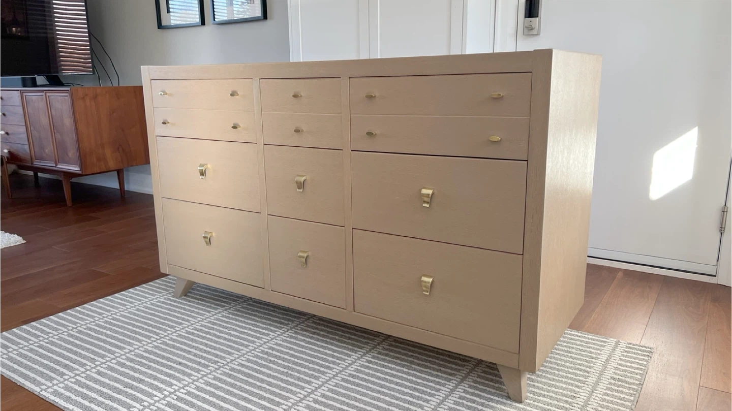 Oak mid-century dresser totally redone inside and out. The finish was stripped and sanded. A neutral paint wash (Algonquin by Fusion Mineral paint) was applied. It was top-coated with General finishes high performance top coat. The hardware is original and solid brass. All drawers slide smoothly.