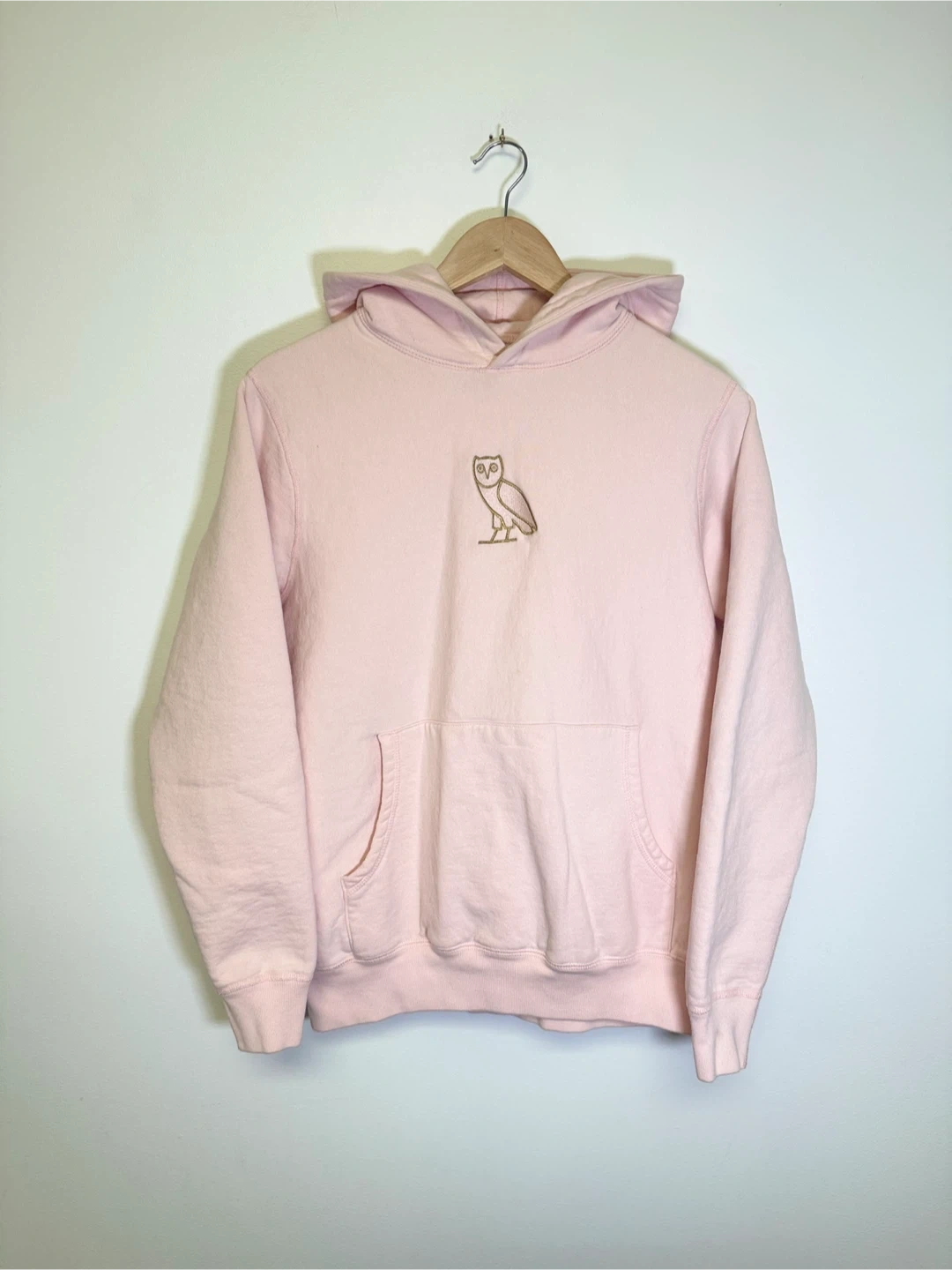 This is an OVO hoodie in a light pink colour. It's a size small and was made in Canada. Features the classic OVO owl logo embroidered on the chest and a front pouch pocket.