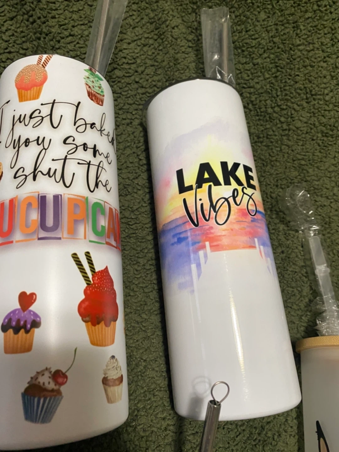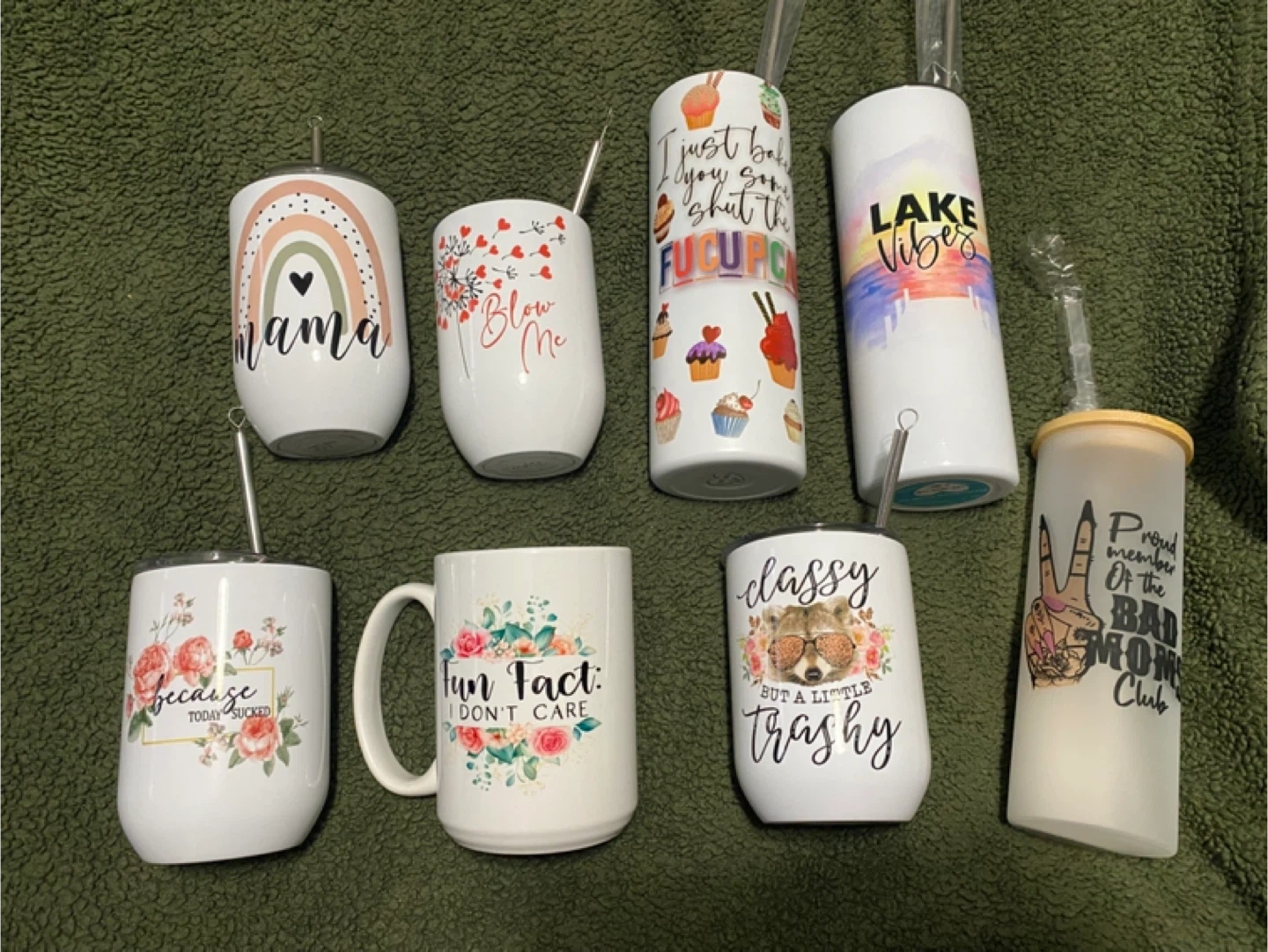 Collection of insulated tumblers and a ceramic mug. Designs include 'mama', 'Blow Me', 'I Just Baked You Some Shut The F*** Up Cupcakes', 'Lake Vibes', 'Because Today Sucked', 'Fun Fact: I Don't Care', 'Classy But A Little Trashy', and 'Proud Member of the Bad Moms Club'. Perfect for hot or cold beverages!
