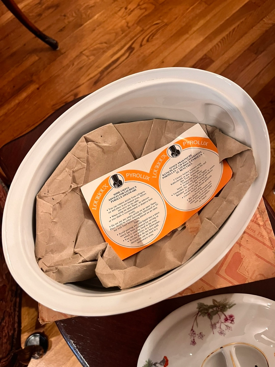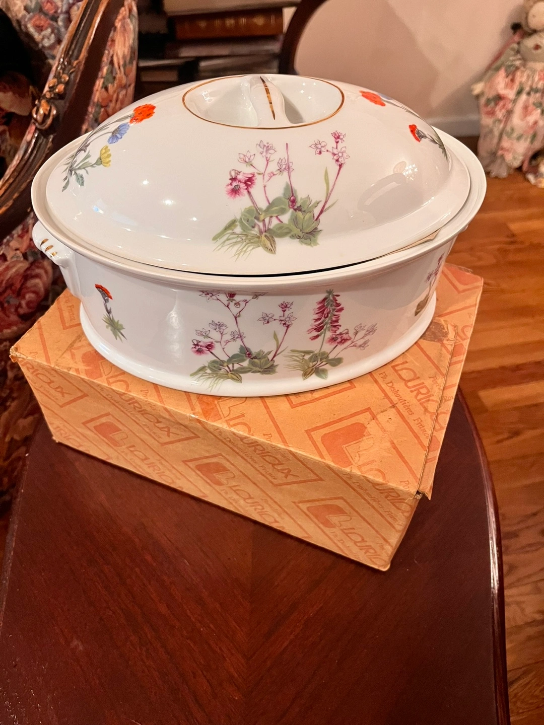 Selling a beautiful LOURIOUX Pyrolux France oval serving dish. It features a lovely floral design on the lid and sides. The dish is in great condition and comes with its original box. It's perfect for serving your favorite meals at family gatherings or special occasions!