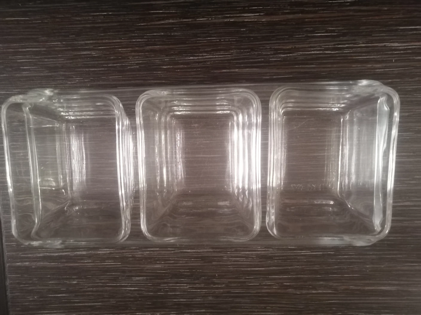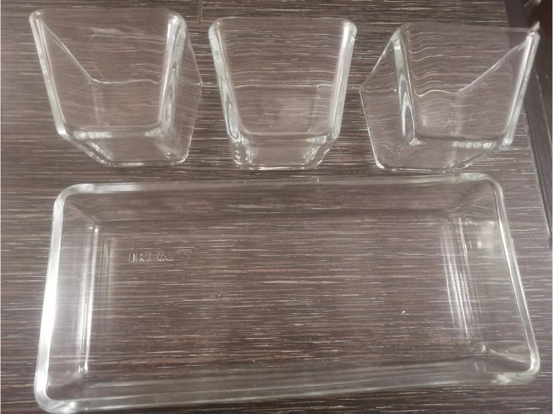 Set of three glass serving dishes. One large rectangular dish and two small rectangular dishes.