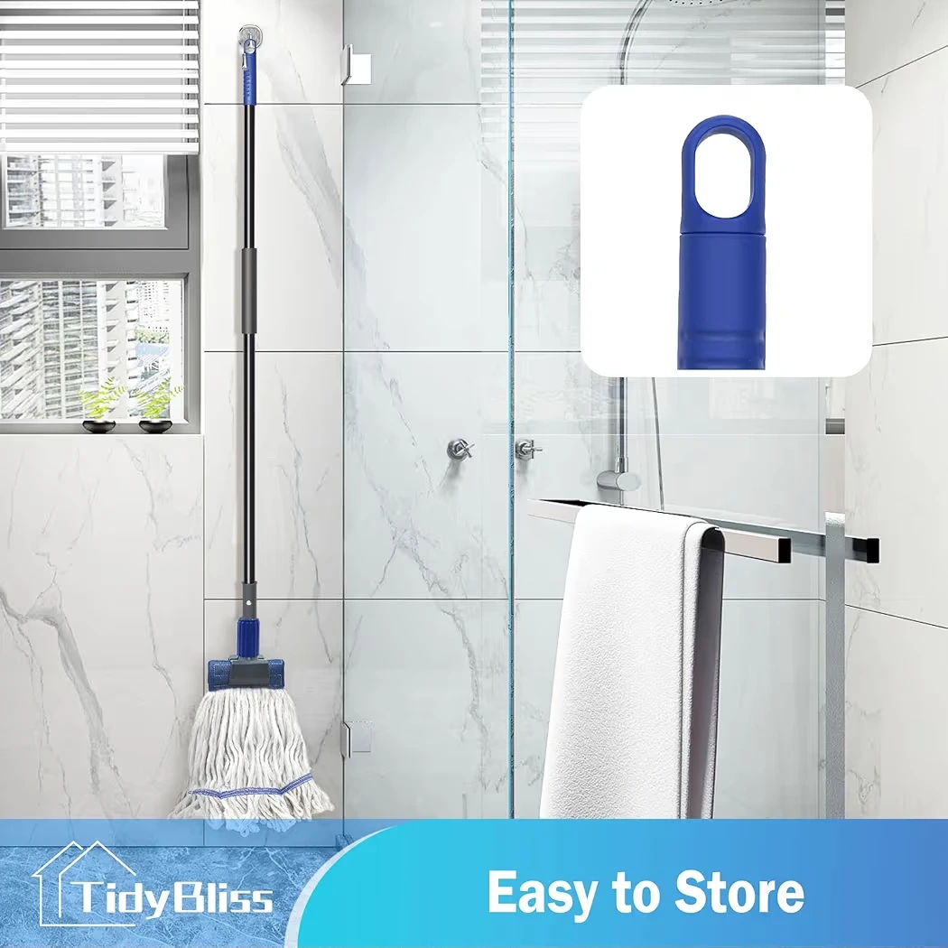This TidyBliss mop features a long, adjustable handle that extends up to 57.5 inches. It has strong water absorption for effective cleaning. The mop is designed for easy storage and multifunctional use.