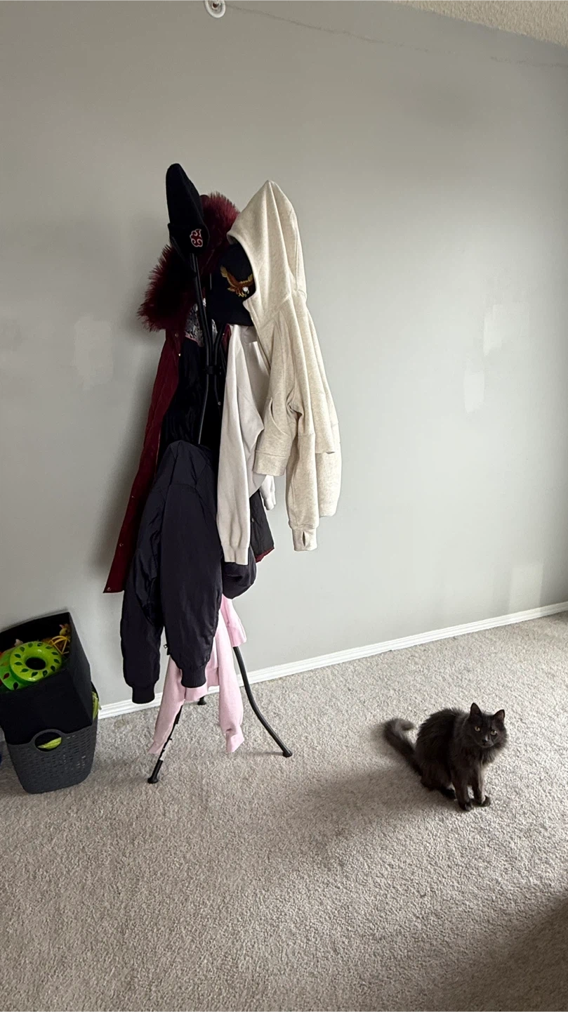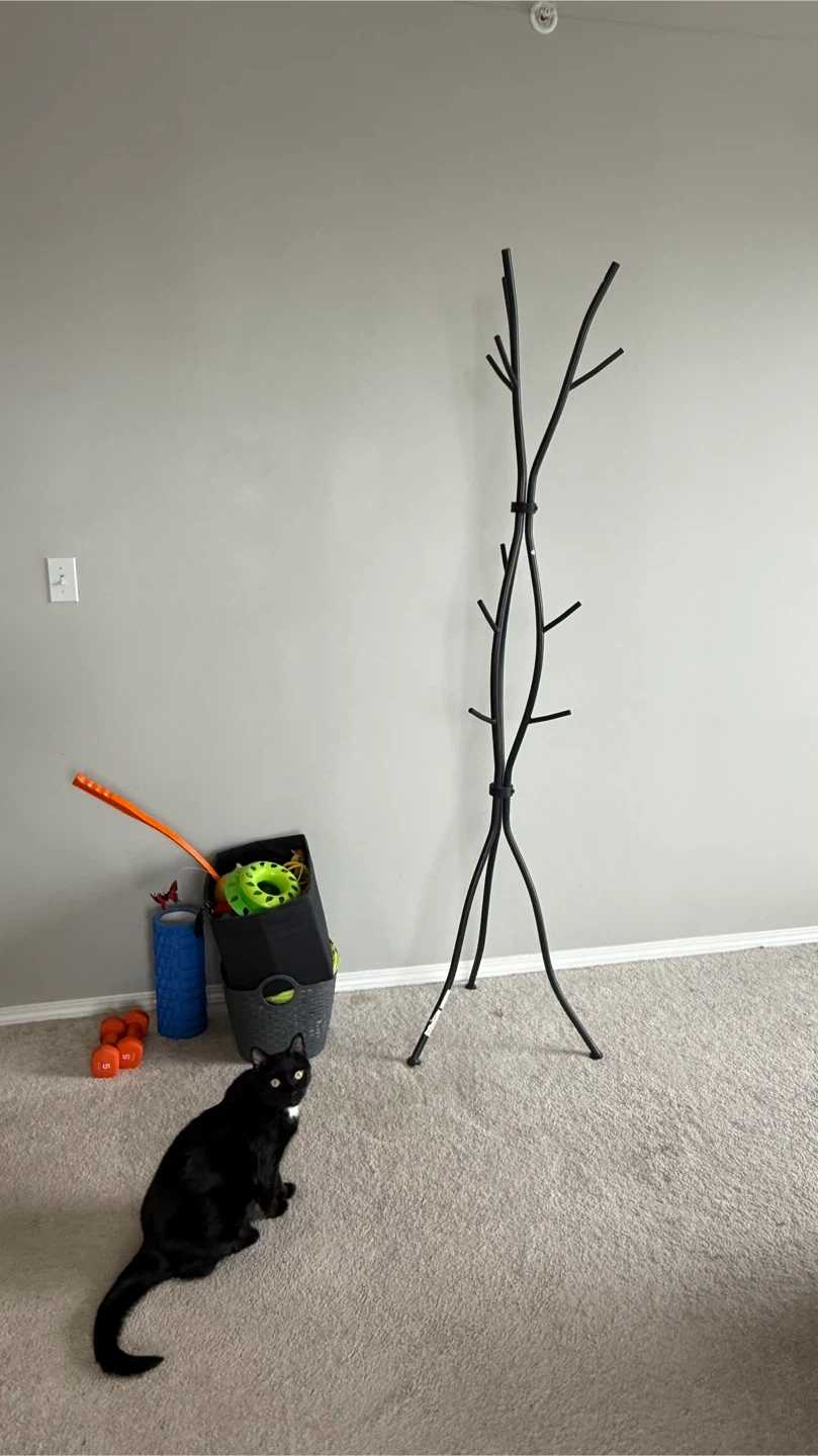 A sleek black metal coat rack tree with multiple branches. It's perfect for hanging jackets, hats, and scarves in your entryway or bedroom.