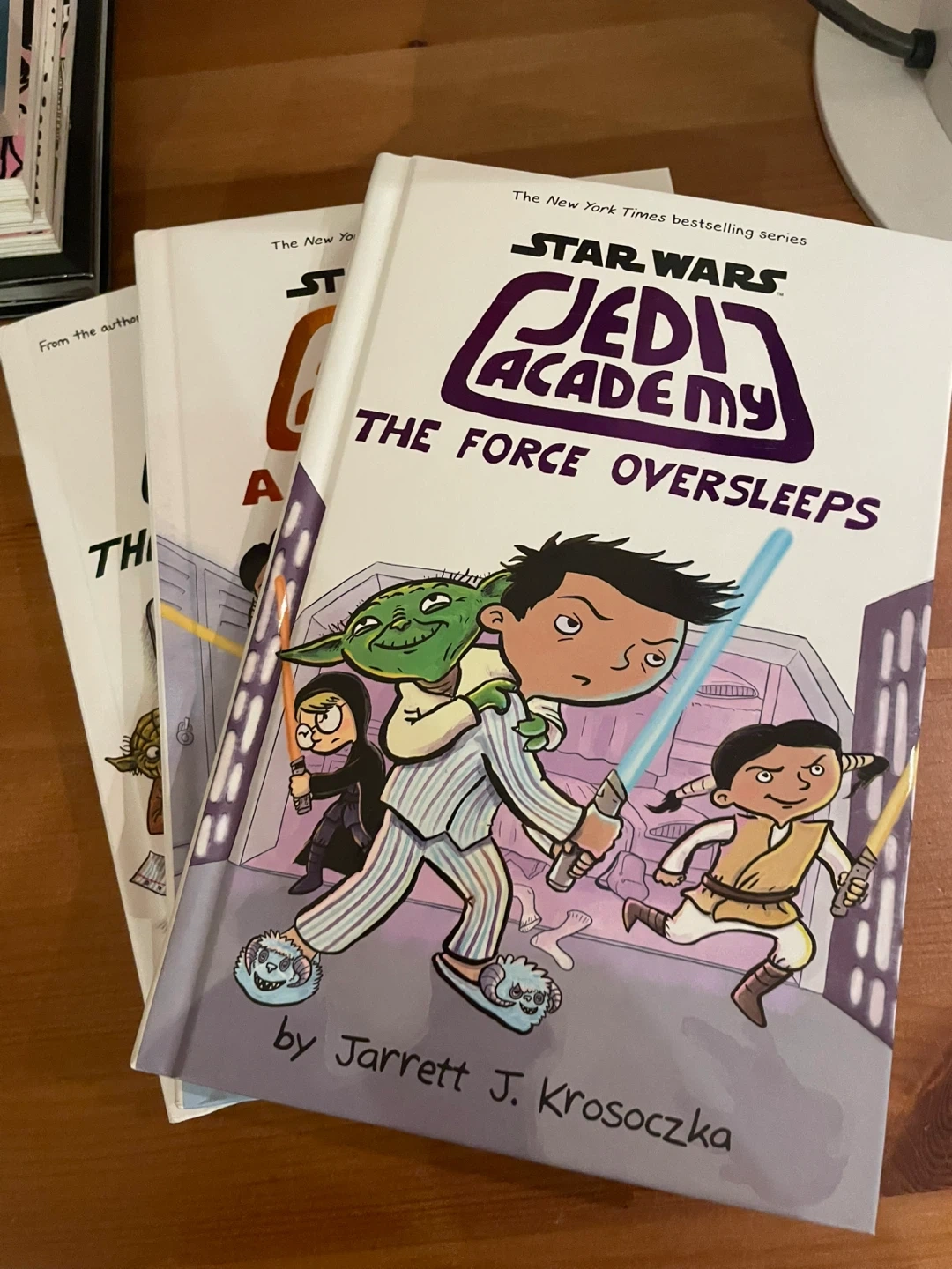 This set includes three Star Wars Jedi Academy books: The Force Oversleeps, A New Class, and The Phantom Bully. They are written and illustrated by Jarrett J. Krosoczka. These books are part of The New York Times bestselling series. Perfect for young Star Wars fans! $10 each $25 for the three of them