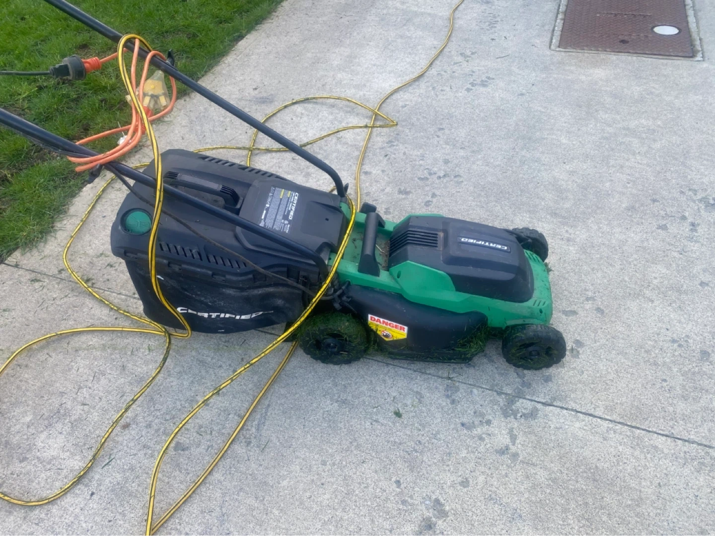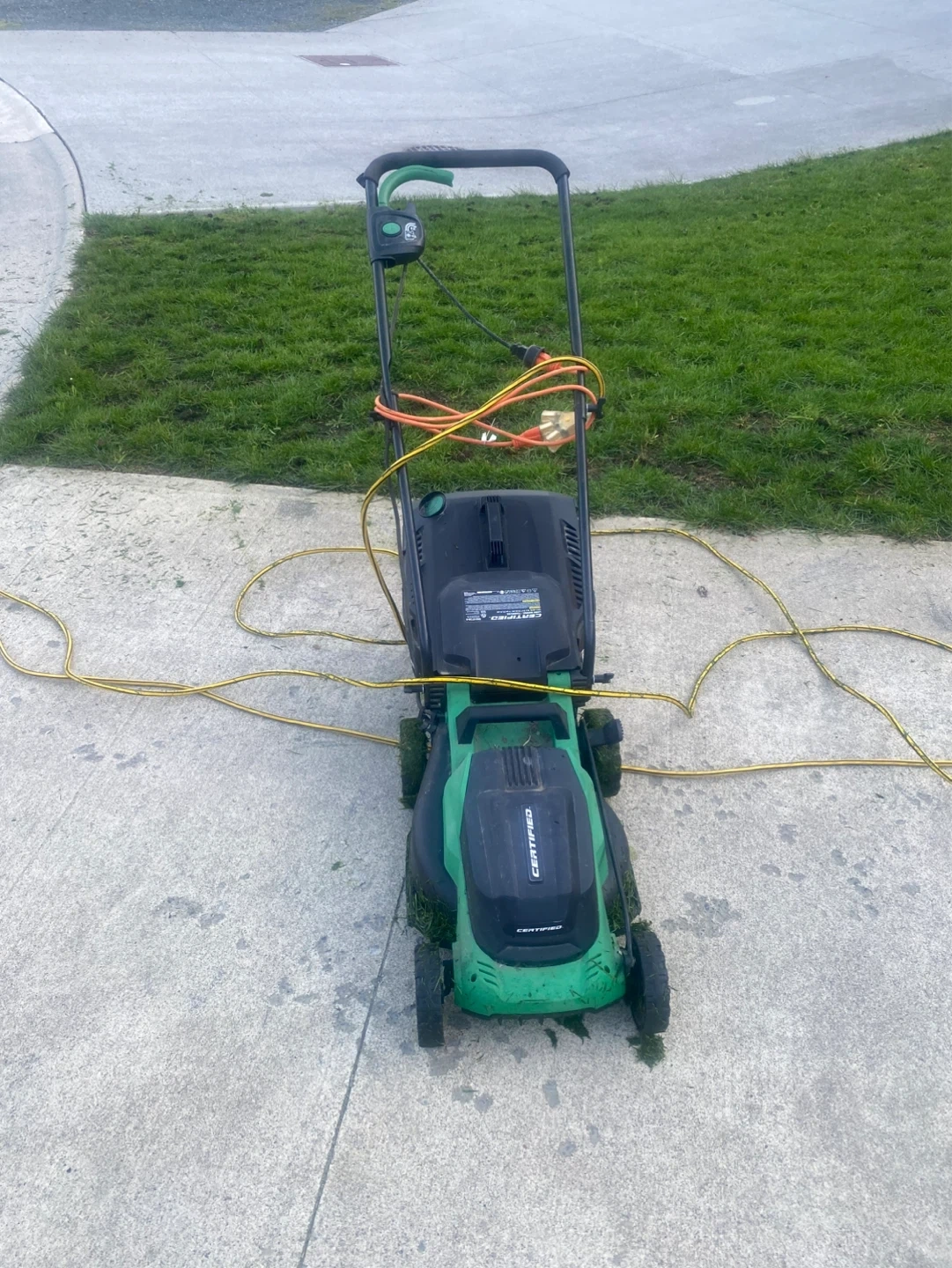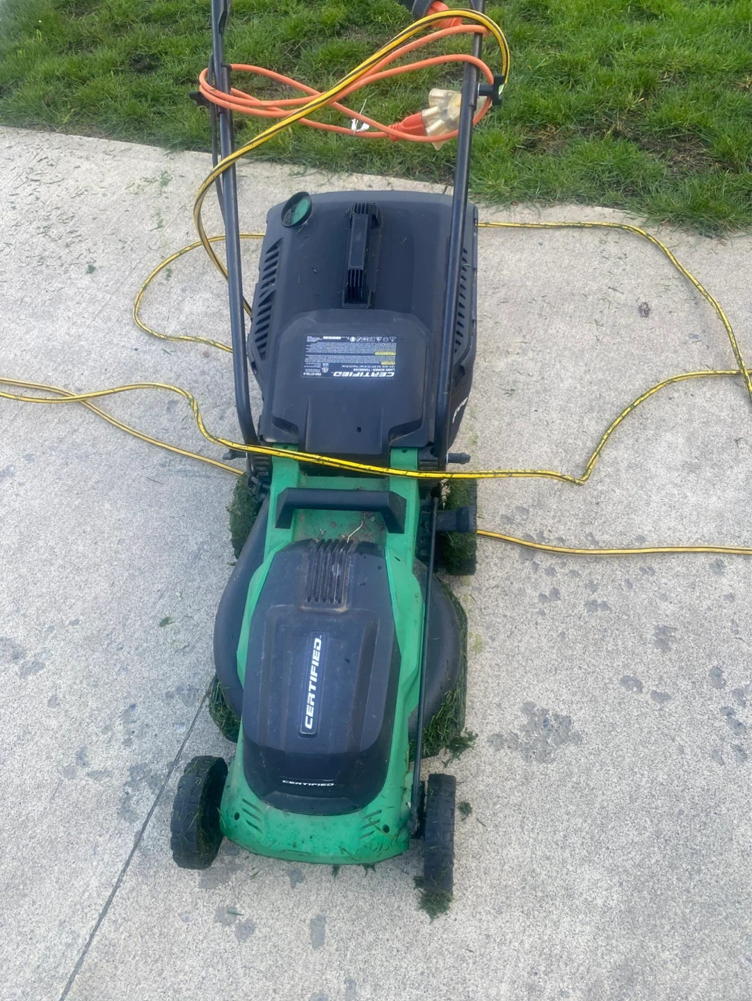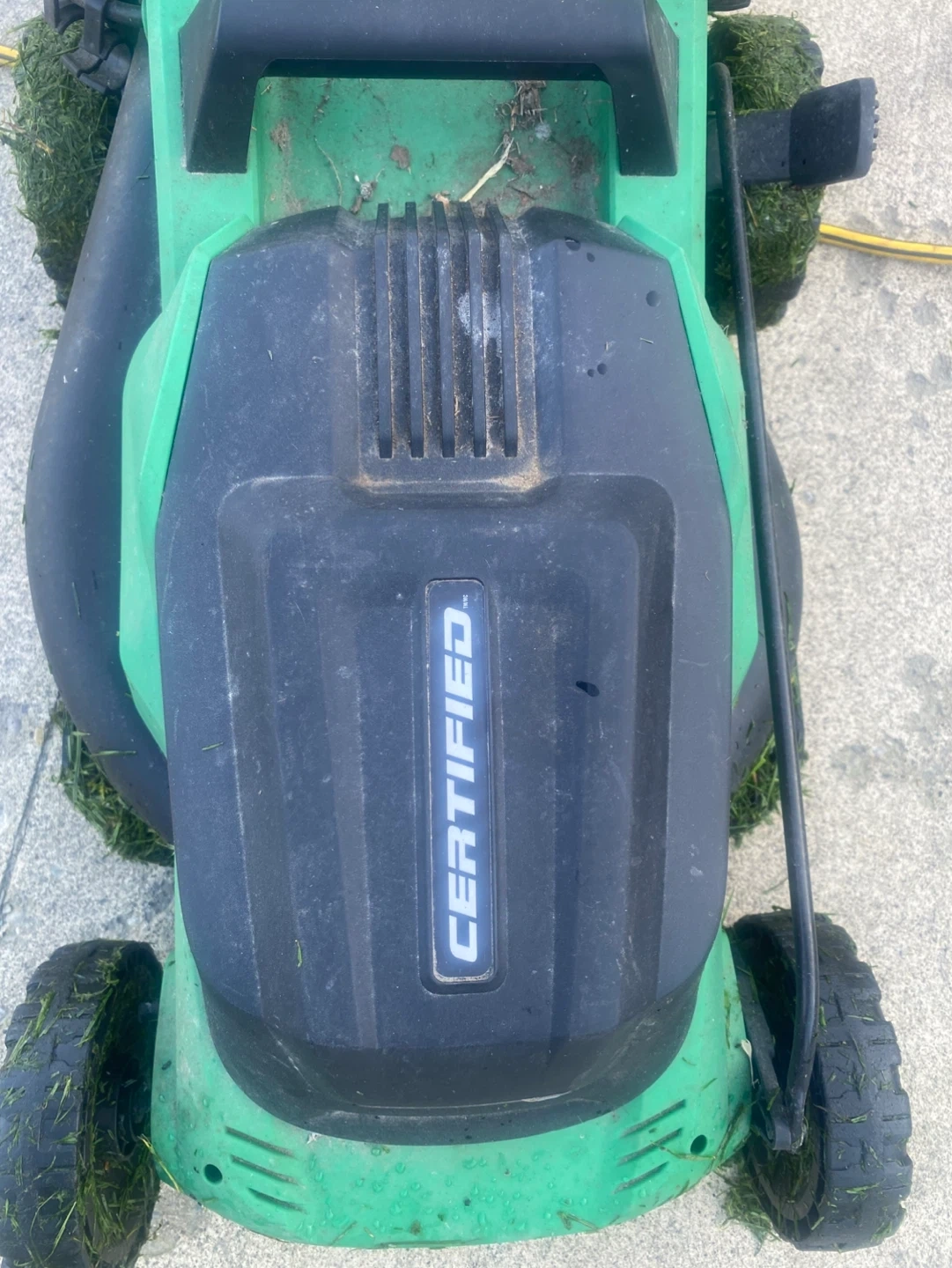 CERTIFIED 120V electric lawn mower with a 14-inch cutting deck. Includes power cord. It's ready for your lawn maintenance needs!