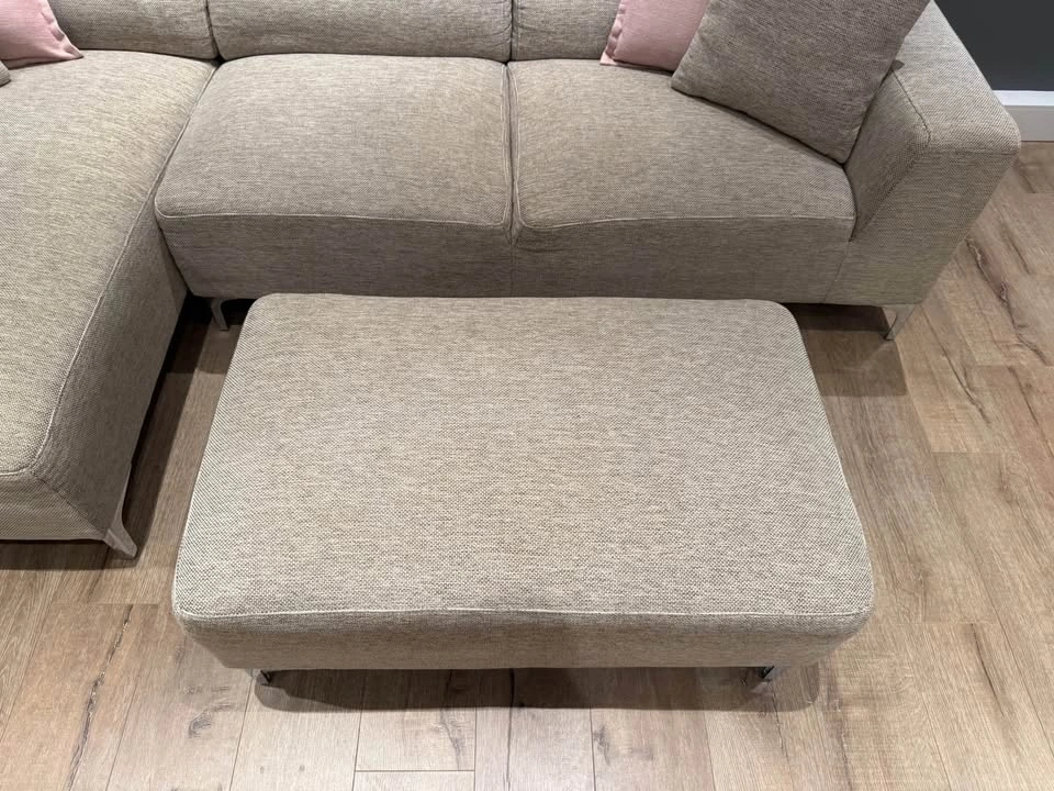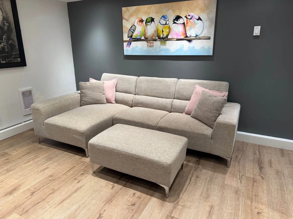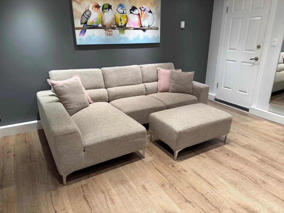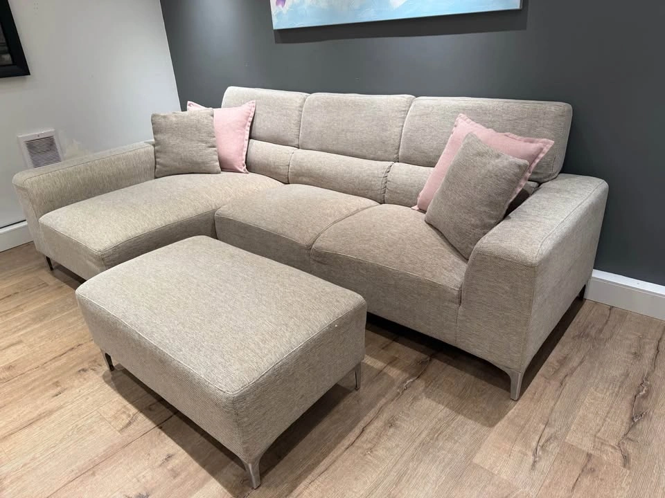 Beautiful QLiving sectional with matching cushions and a coordinating ottoman, featuring soft beige upholstery, wide arms, and a sleek low-profile design. The subtle textured fabric and tailored lines bring a refined, modern touch to any living space. ✨ Features: βœ” Includes matching cushions for a complete, cohesive look βœ” Modern silhouette with clean edges and low-profile backrests βœ” Matching ottoman (23β€³ Γ— 28β€³) – can be used separately or as a chaise extension βœ” Deep, supportive seating ideal for lounging or entertaining βœ” Durable woven fabric upholstery with high-resilience foam cushions βœ” Professionally shampooed, cleaned, and sanitized βœ” No tears, no stains, no issues βœ” Decorative pink cushions not included πŸ“ Dimensions: β€’ Height: 22β€³ β€’ Arm length: 33β€³ β€’ Seat height: 15β€³ β€’ Chaise length: 56β€³ β€’ Full width: 101β€³ β€’ Ottoman: 23β€³ Γ— 28β€³ πŸ“ Pickup near Coquitlam Centre