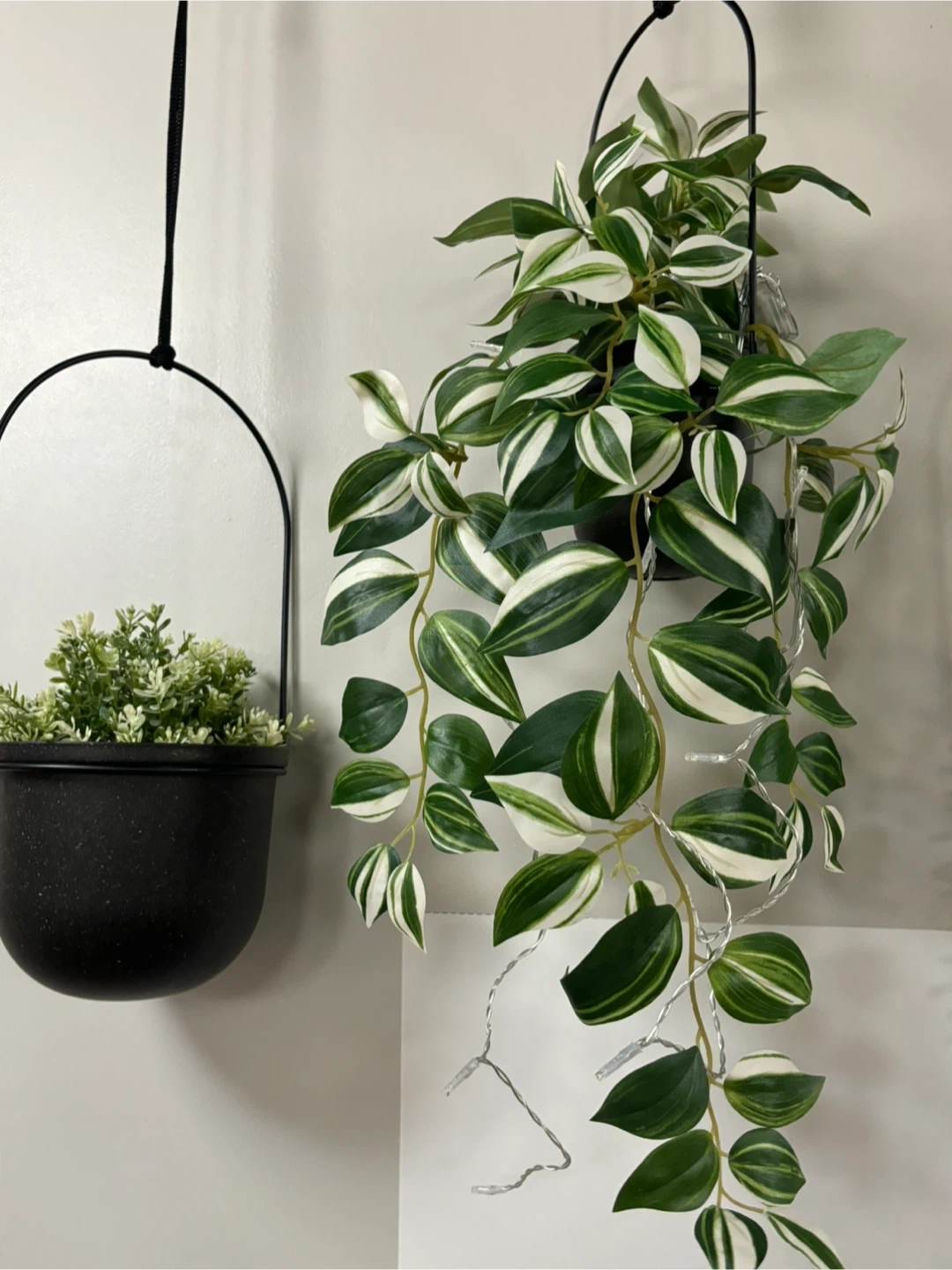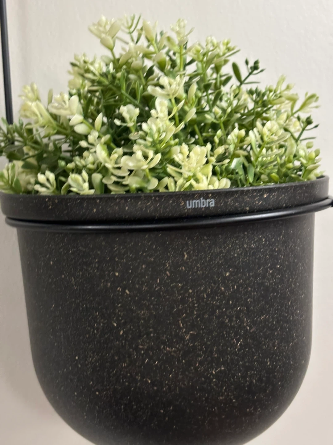This Umbra hanging planter features a speckled black finish and comes with a faux plant. It's ideal for adding a touch of greenery to any space without the need for watering! The planter has a modern design and includes a plant with variegated leaves.