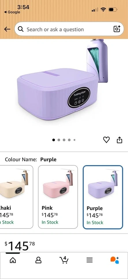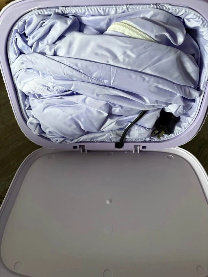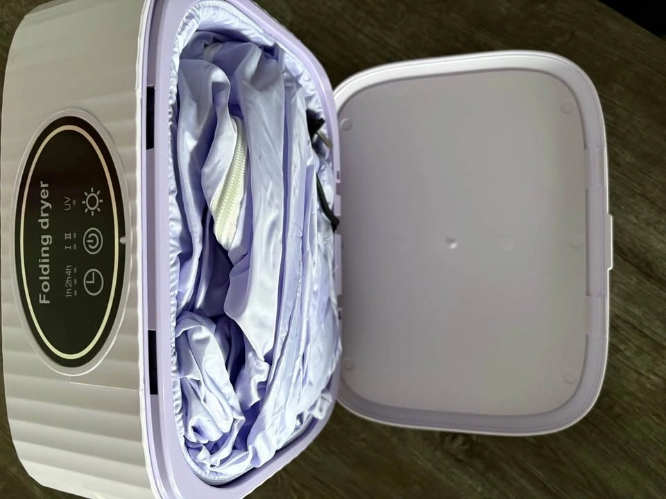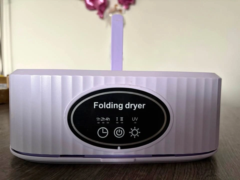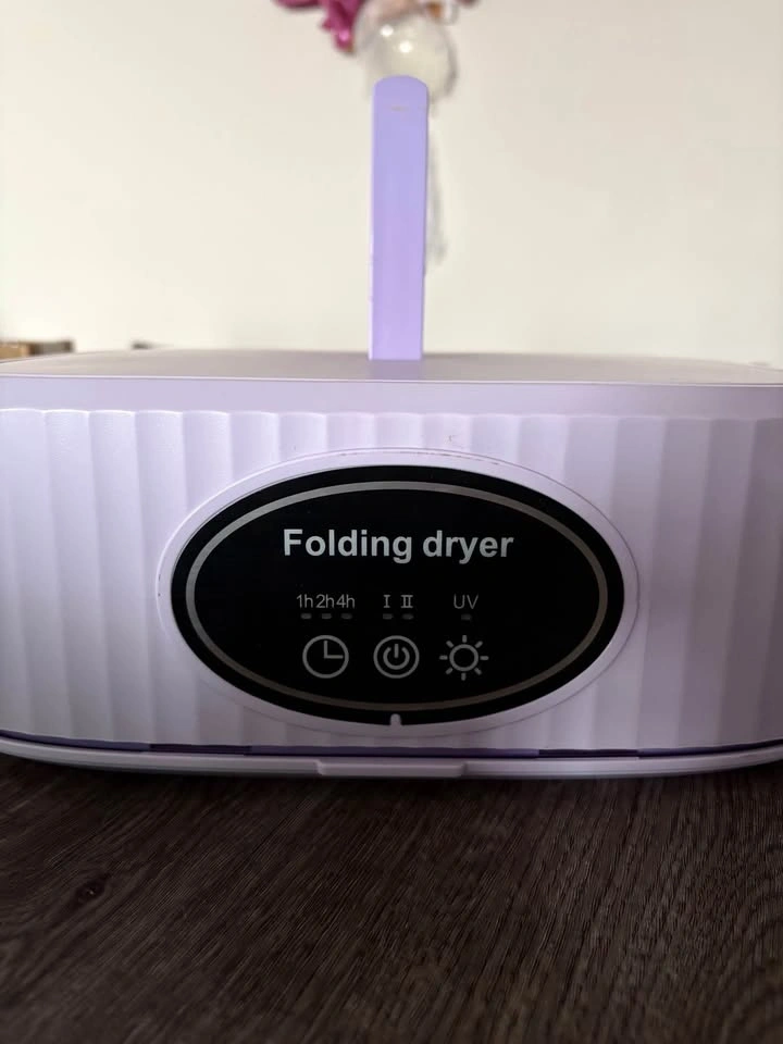 Compact folding dryer is super handy for small spaces or travel. Has timer settings for 1h, 2h, or 4h. Also has two drying levels and a UV light function. Cute light purple color. Power cord included inside.