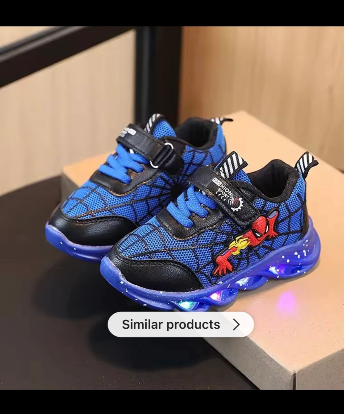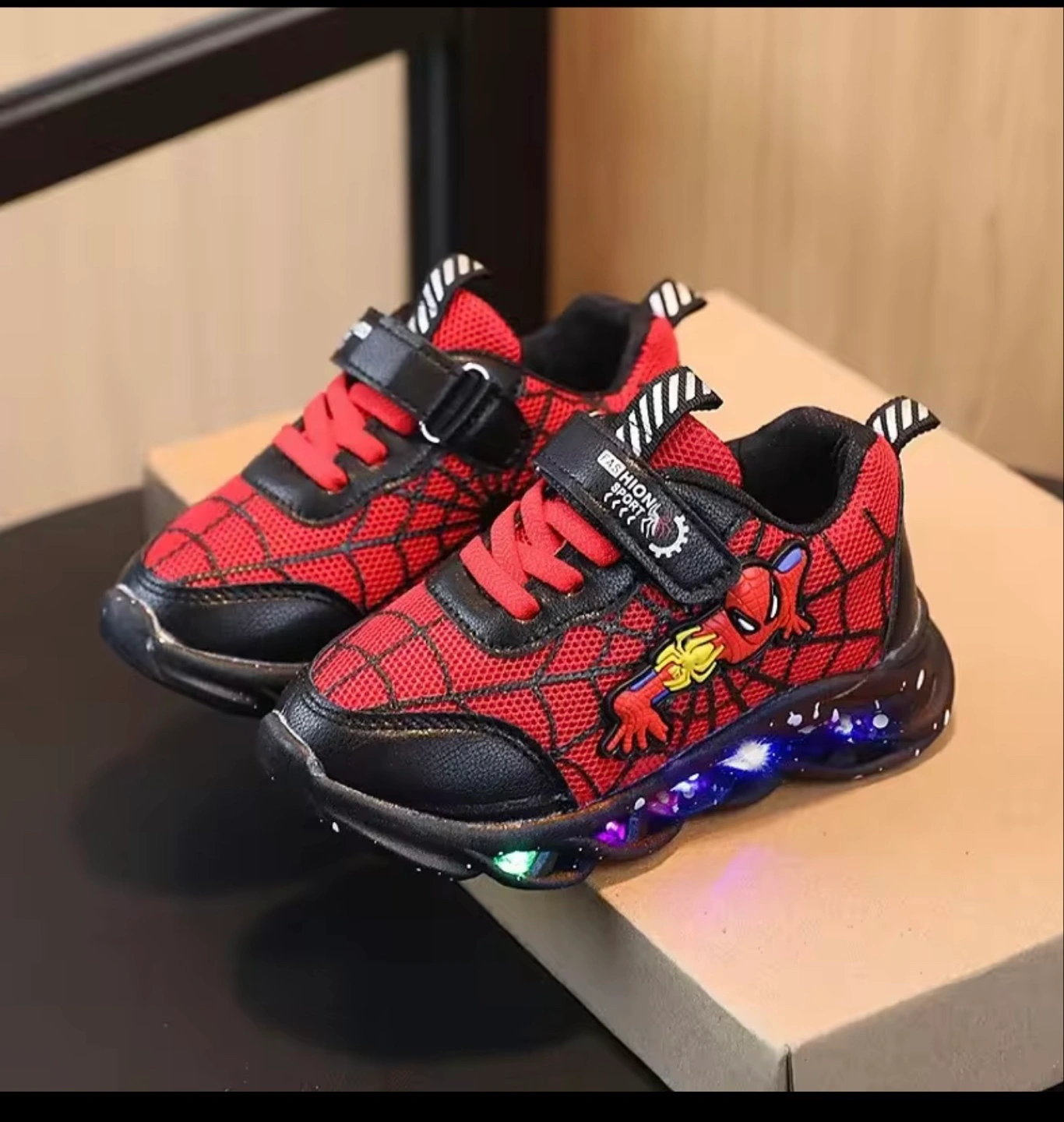 Cute children's shoes. Feature Spider-Man design. Light-up soles. Velcro closure. Available in red , black and blue. Perfect for indoor and outdoor