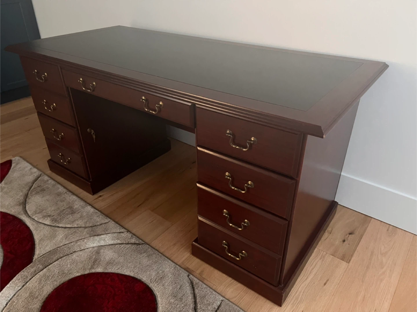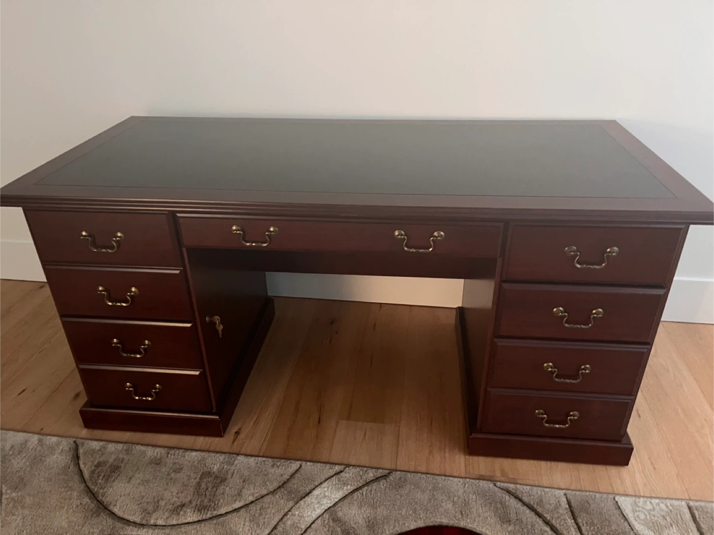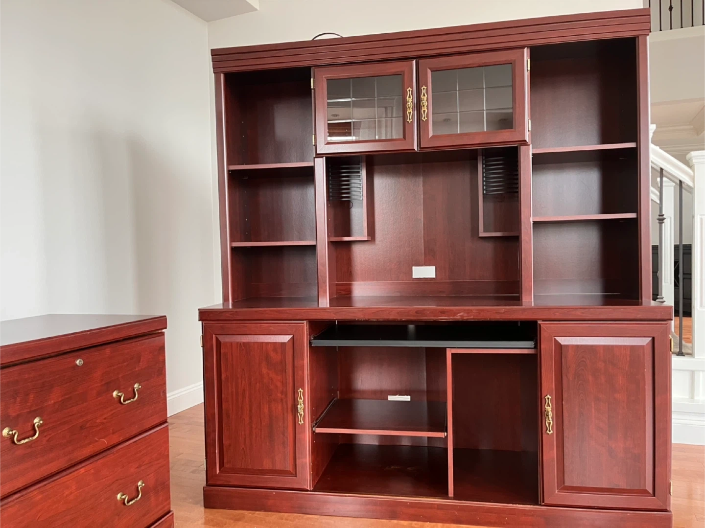 This executive desk and hutch set is crafted from rich cherry wood. It features a spacious desk with multiple drawers, a central hutch with shelving and cabinet space plus a filing cabinet. Plenty of storage for your home office needs!