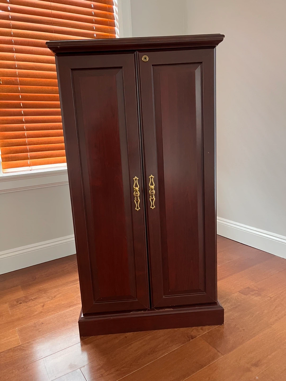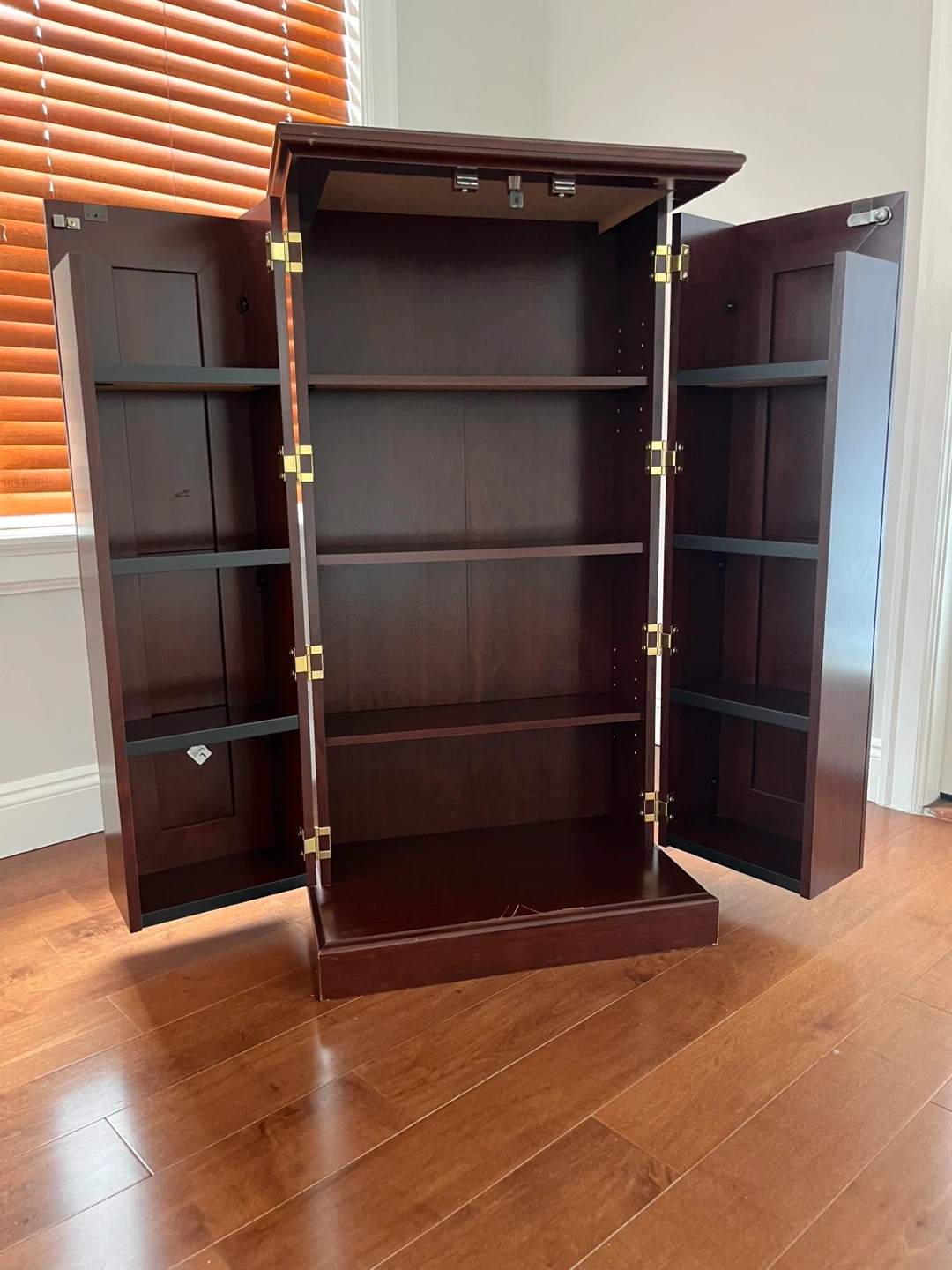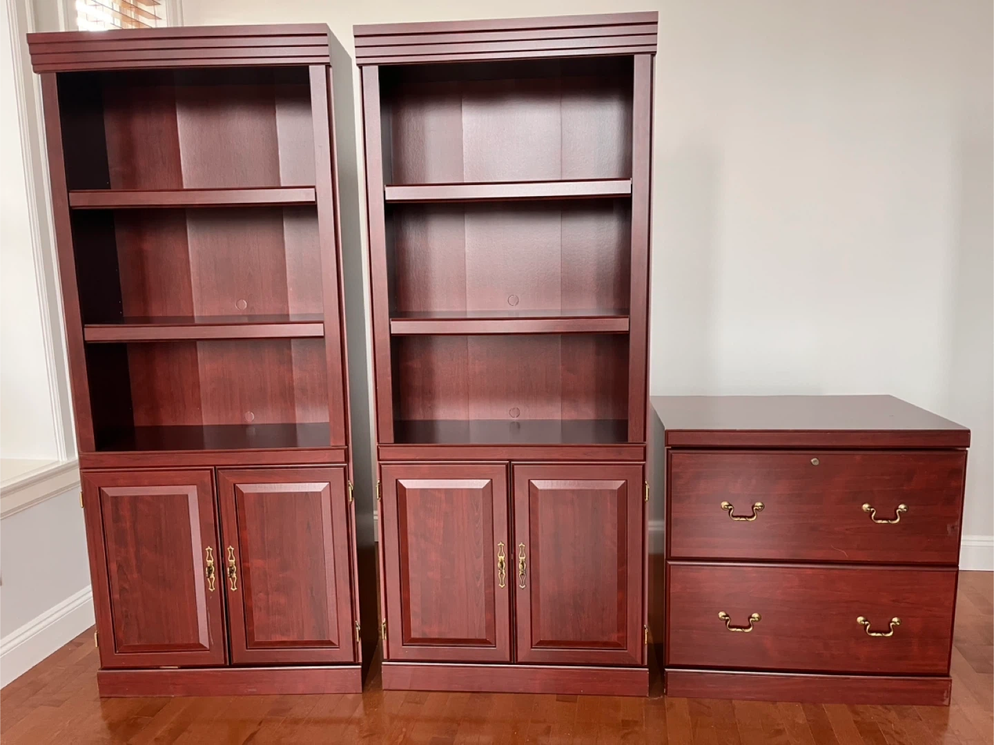 This executive desk and hutch set is crafted from rich cherry wood. It features a spacious desk with multiple drawers, a central hutch with shelving and cabinet space plus a filing cabinet. Plenty of storage for your home office needs!