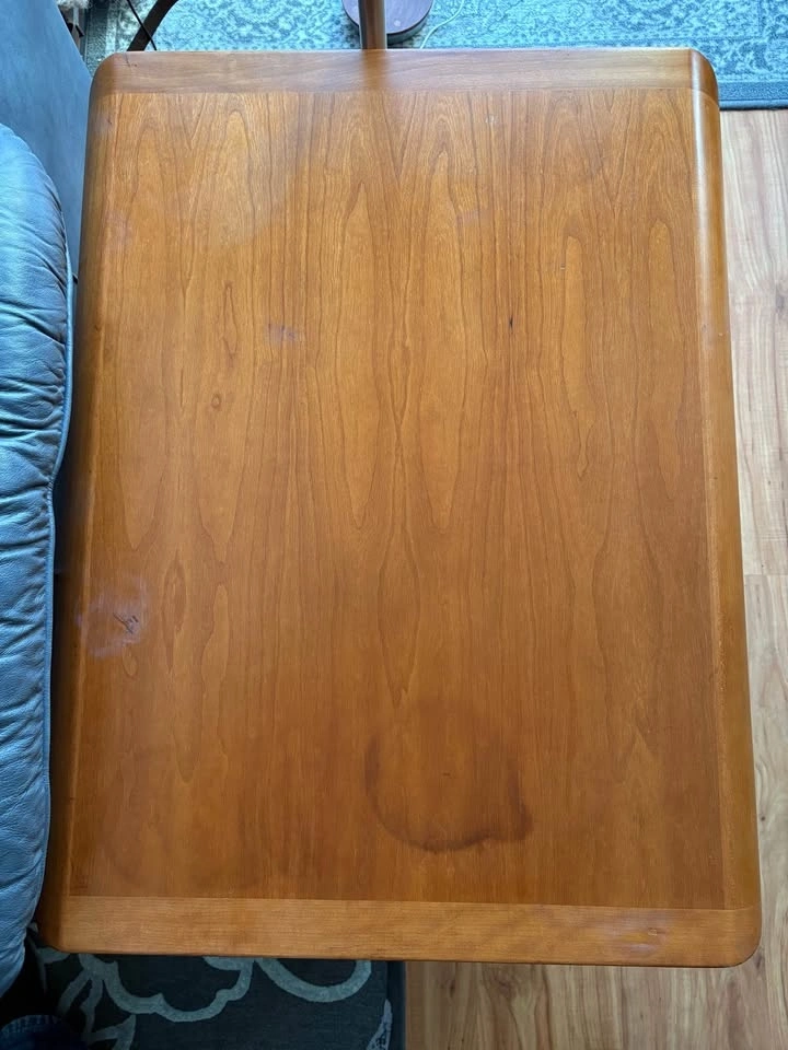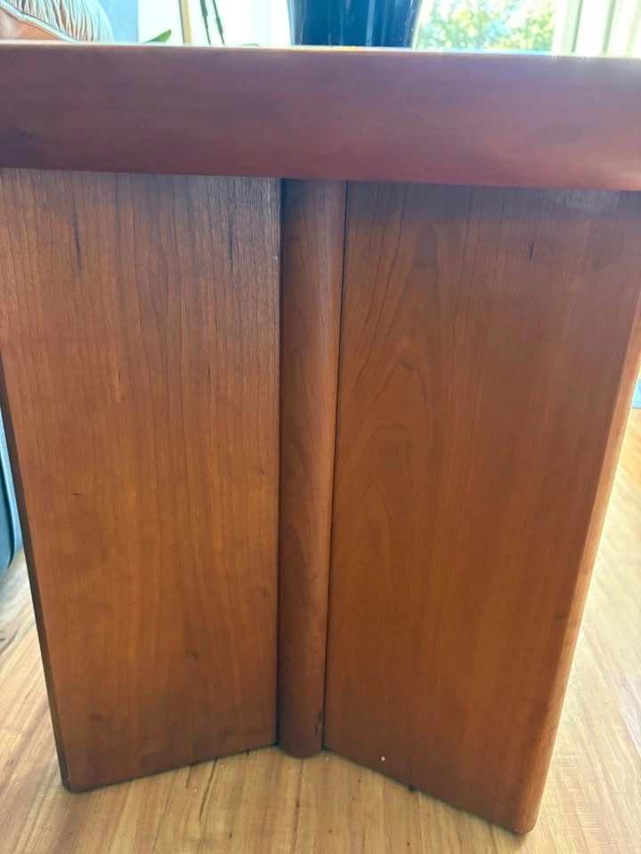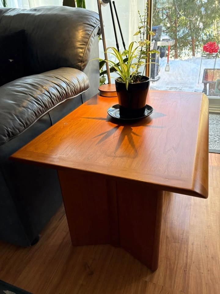 Elegant Mid-Century Modern teak side table, Danish modern design by NORDIC furniture. Please, see pictures for condition and measurements. Iconic Minimalist design. It will be a beautiful addition to your space. A few minor signs of wear (stains & marks as seen in the 9th photo) Priced accordingly. Easy project. It’s really heavy and solid. Pickup only in Burlington. (Pinedale Ave) Sorry, NO delivery. Priced to sell and FIRM AT $140. Thank you.