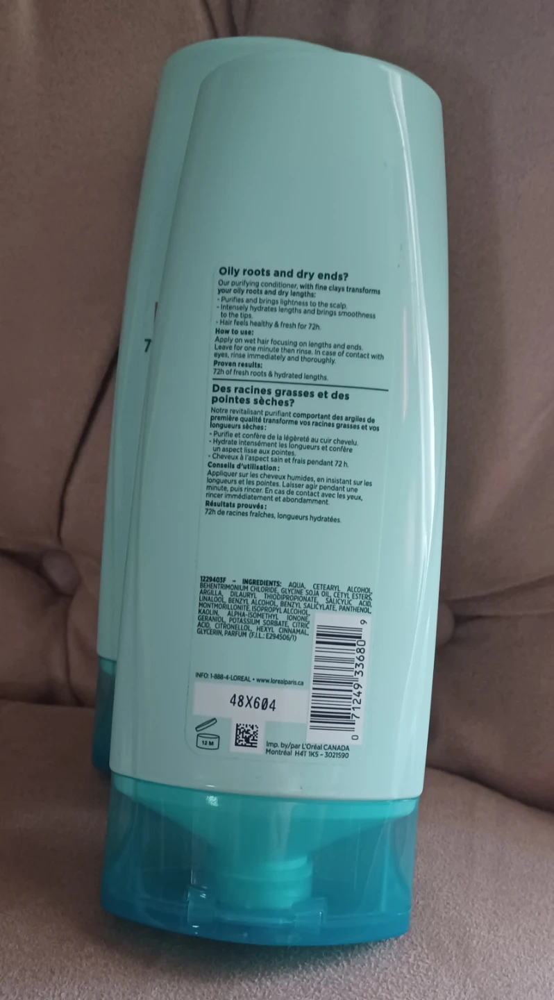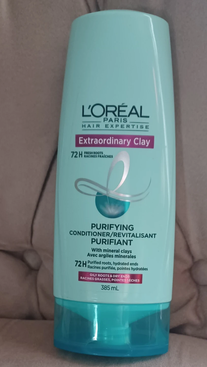 This L'Oréal Paris Extraordinary Clay Purifying Conditioner is designed for oily roots and dry ends. It purifies the scalp and hydrates lengths for 72 hours. The formula with mineral clays leaves hair healthy, fresh, and light. 385 mL bottles.