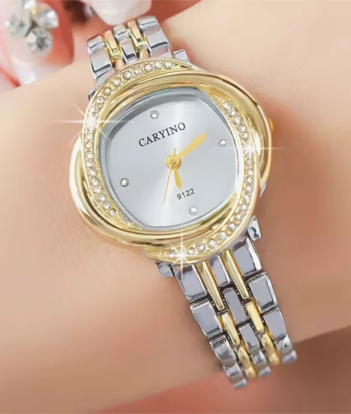 A Caryino women's watch with a two-tone metal band. It features a crystal-accented bezel and a silver-toned face with gold-toned hands and markers. This watch combines classic style with a bit of sparkle!