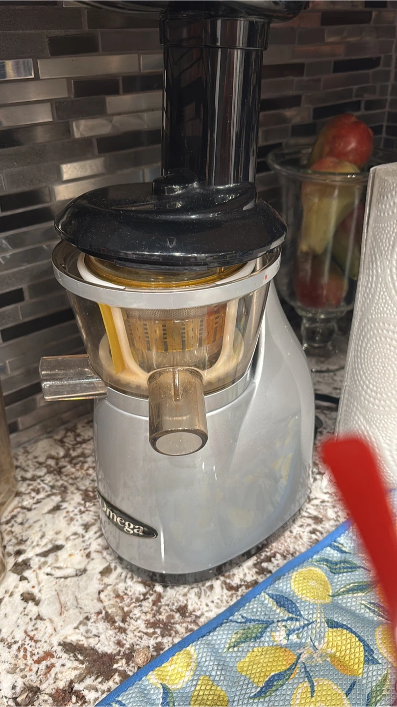 This is an Omega juicer in silver. It's designed for extracting fresh juice from fruits and vegetables. Juicing fresh ingredients is a great way to get your daily vitamins!