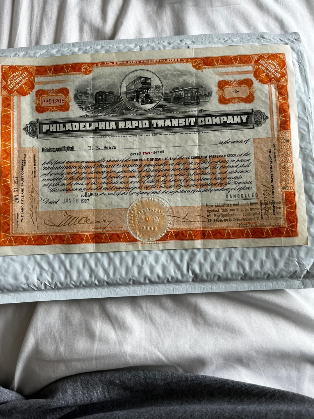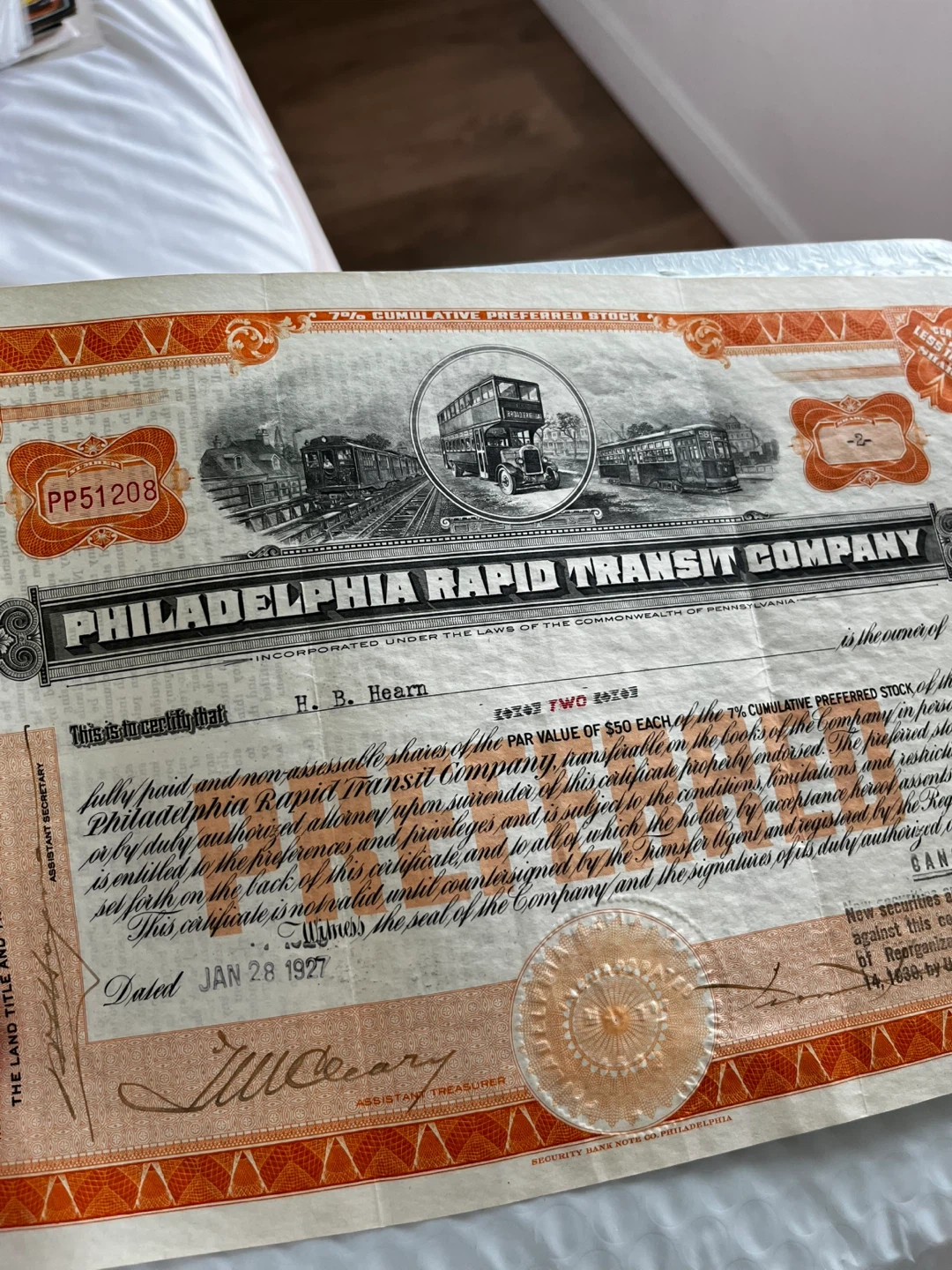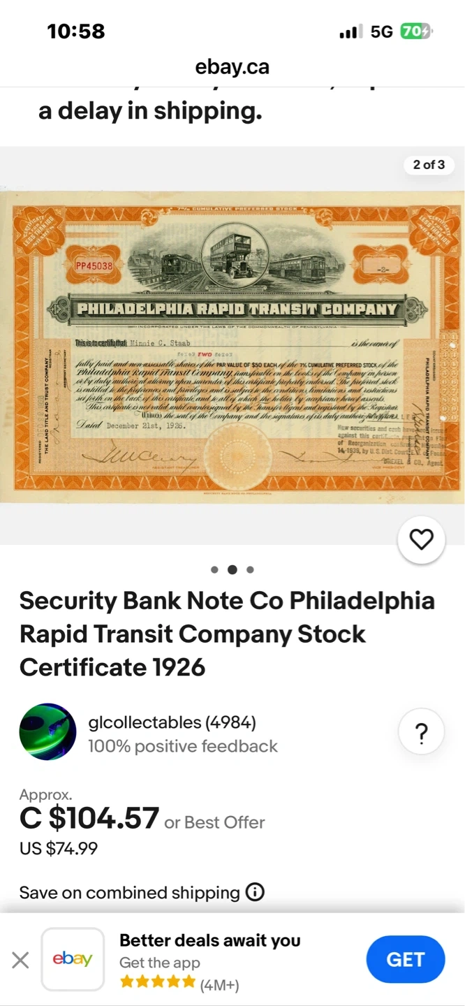 Buy & SellUSA Note Co Philadelphia Transit Company Stock Certificate 1926USA Note Co Philadelphia Transit Company Stock Certificate 1926$65Security Bank Note Co Philadelphia Rapid Transit Company Stock Certificate 1926 glcollectables (4984) 100% positive feedbackWHERE TO MEETCheck LocationView MapSELLERverifiedMustafaMarine Hamilton39038 reviews0 chats·1 favorites·6 viewsSEND CHAT TO SELLERHi Mustafa! I’m interested in your listing.Hi Mustafa! I’m interested in your listing.Get the Karrot app to chatSign In to chat