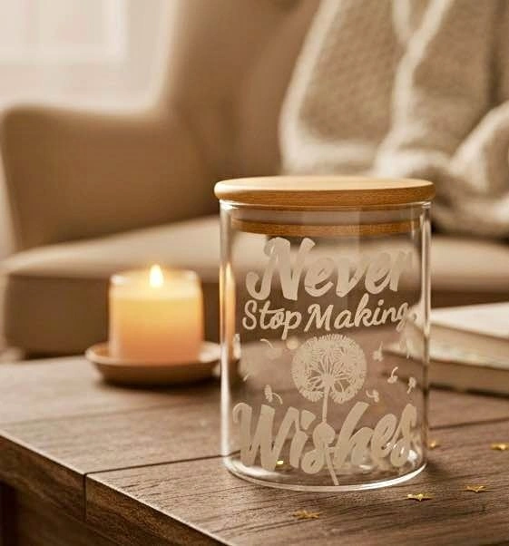 Elegantly crafted Wishes Jar with a sleek, high-quality glass body and a natural bamboo lid. Blends seamlessly into any room.