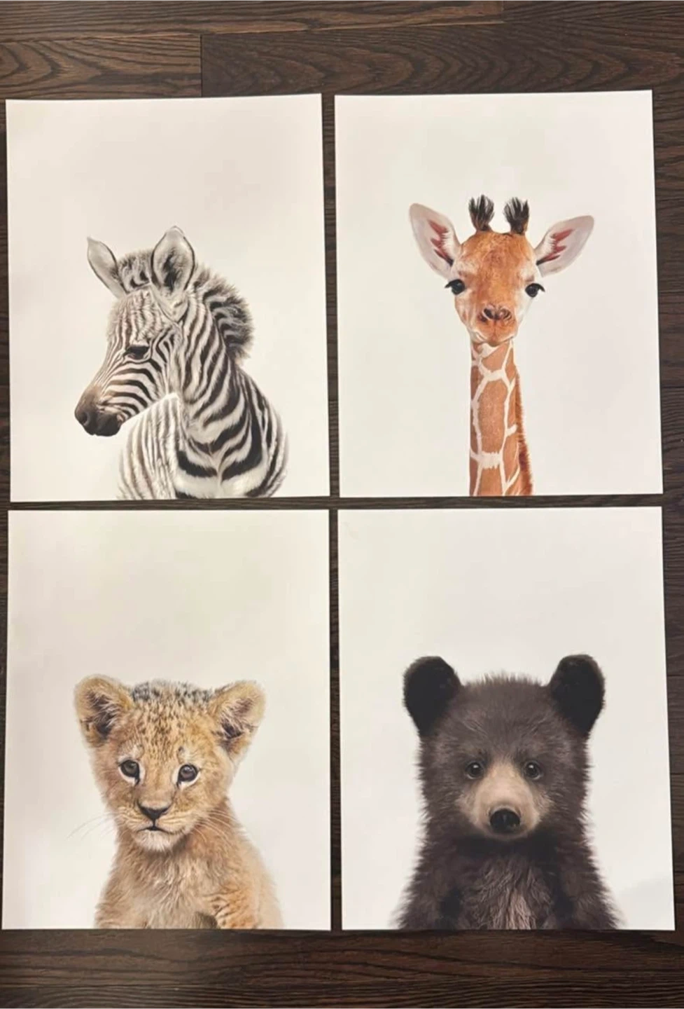 This is a set of four art prints. It includes a zebra, a giraffe, a lion cub, and a bear cub. They are 11x14, unframed.