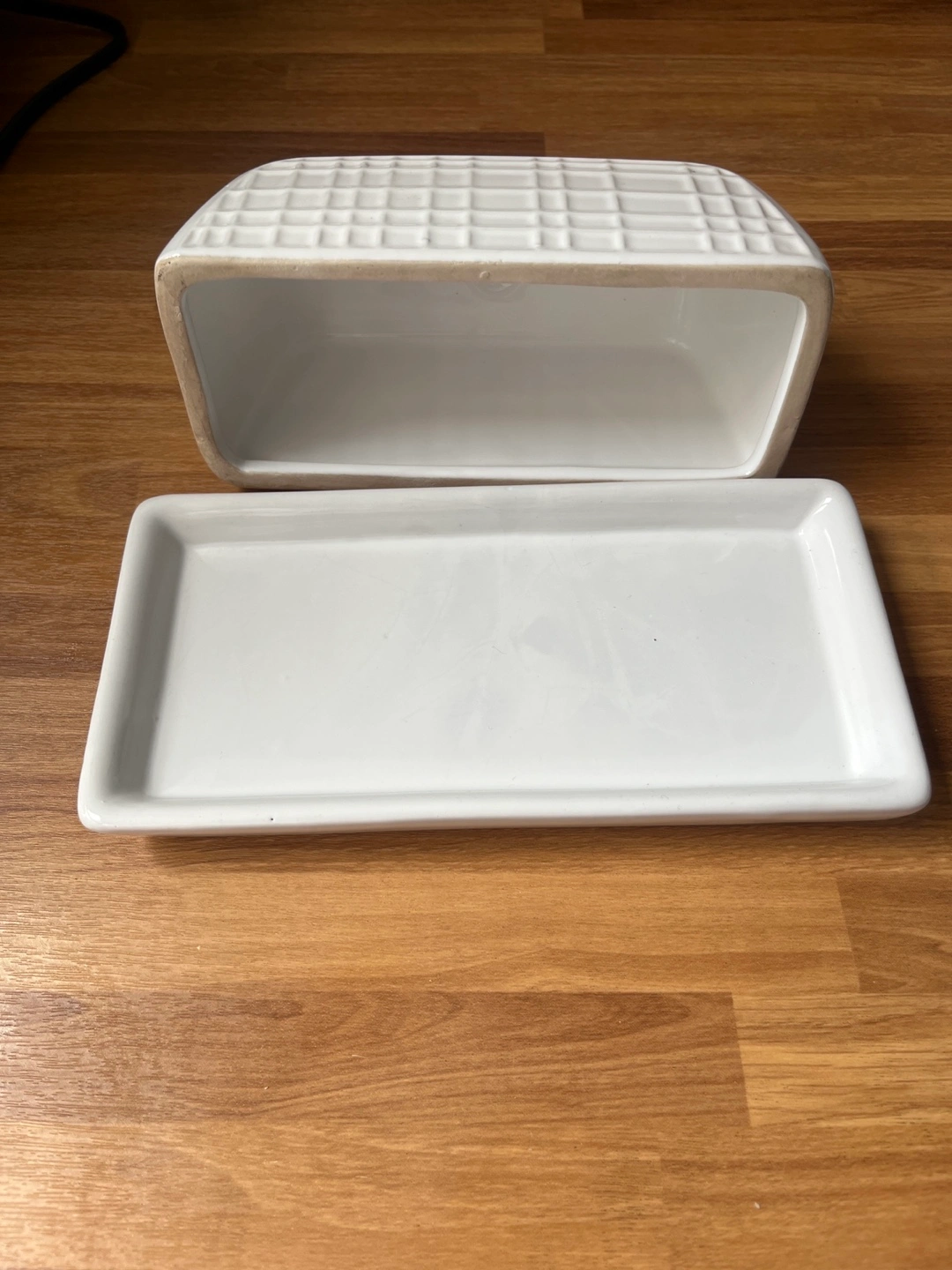 Cute white ceramic butter dish. Features a grid pattern. Includes a separate dish and lid. Perfect for any kitchen decor.