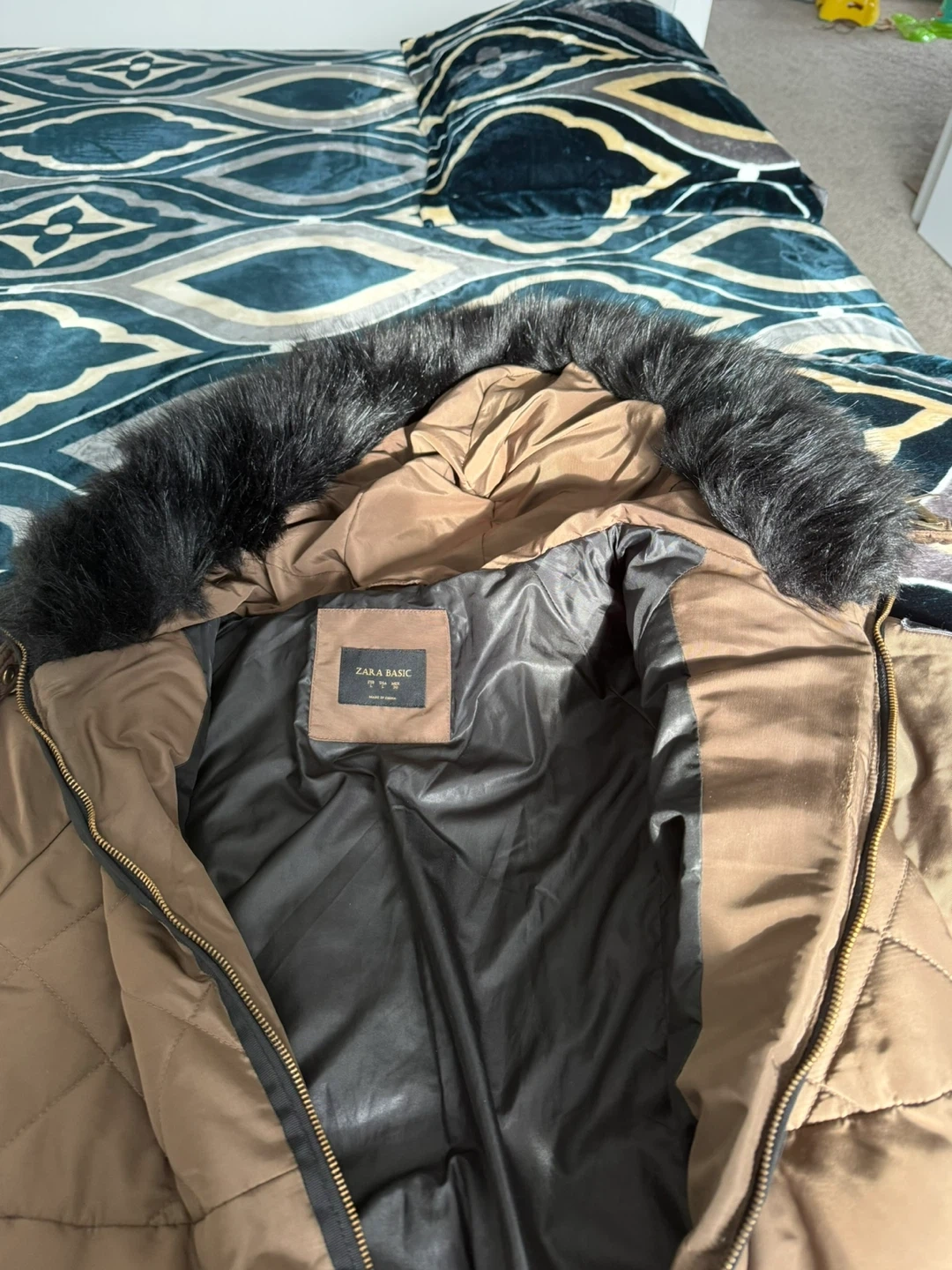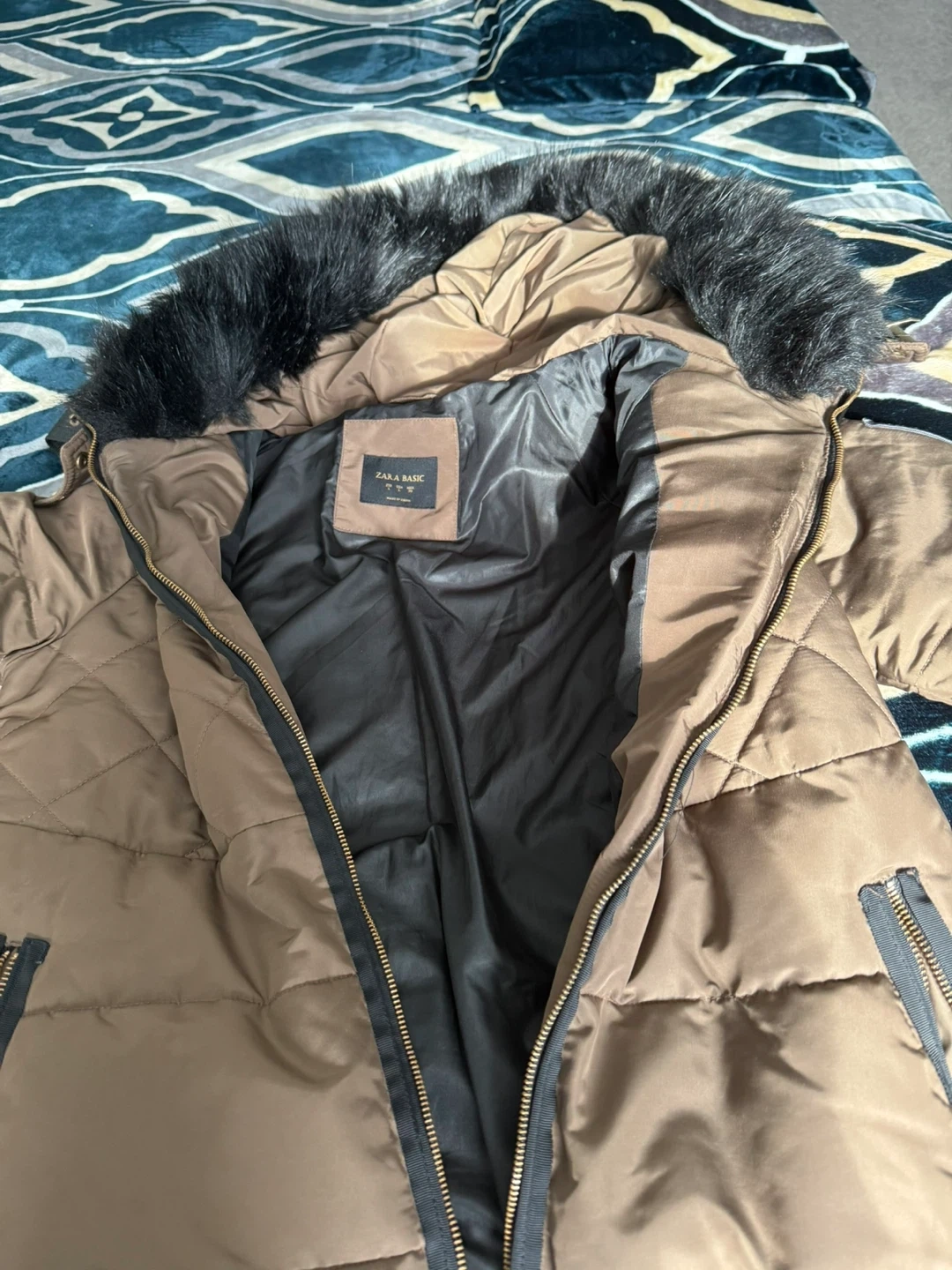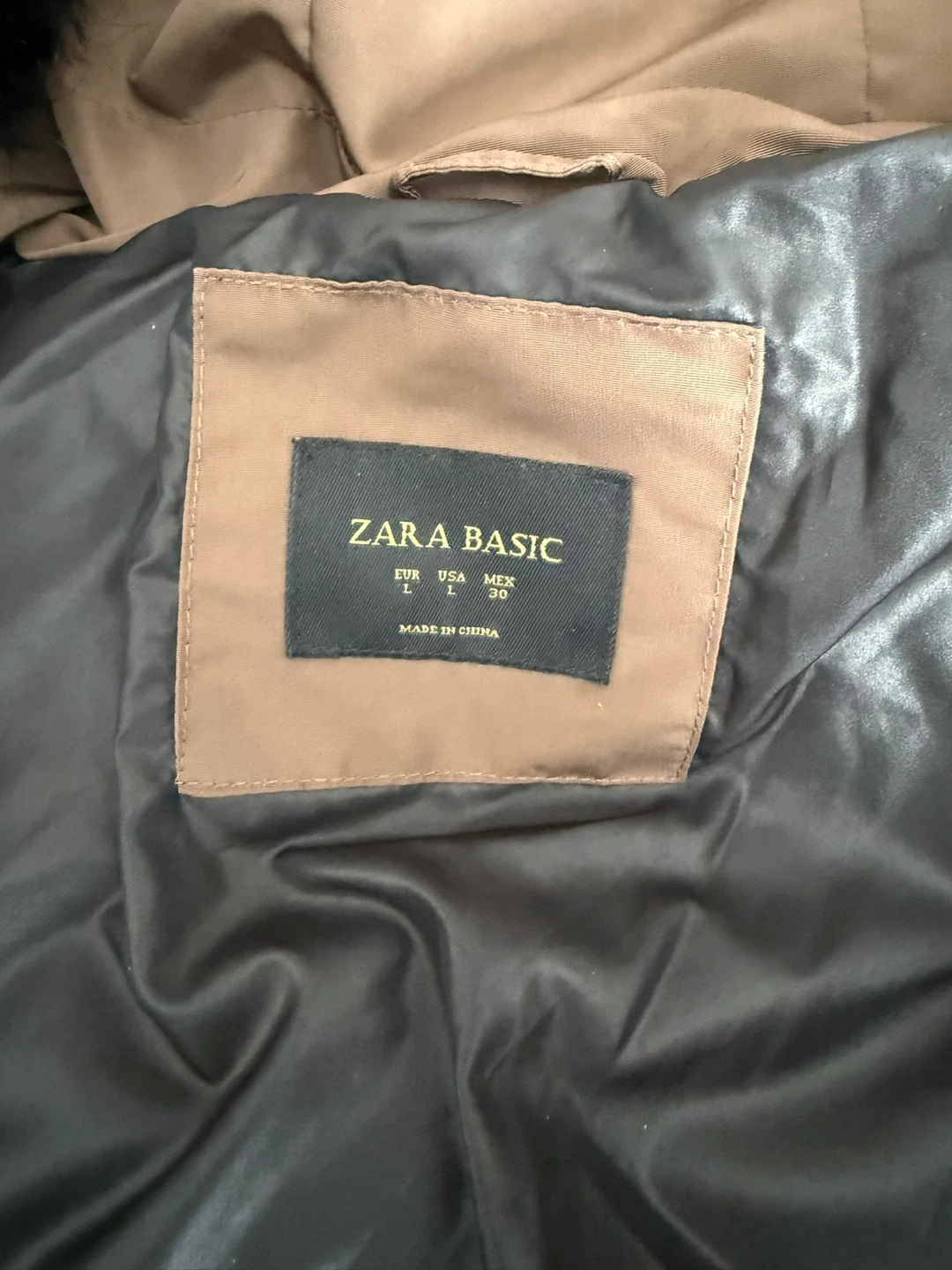 Stay warm this season in this stylish Zara Basic brown puffer coat. It features a cozy fur-lined hood and a full zip closure. The size is large, offering a comfortable fit.